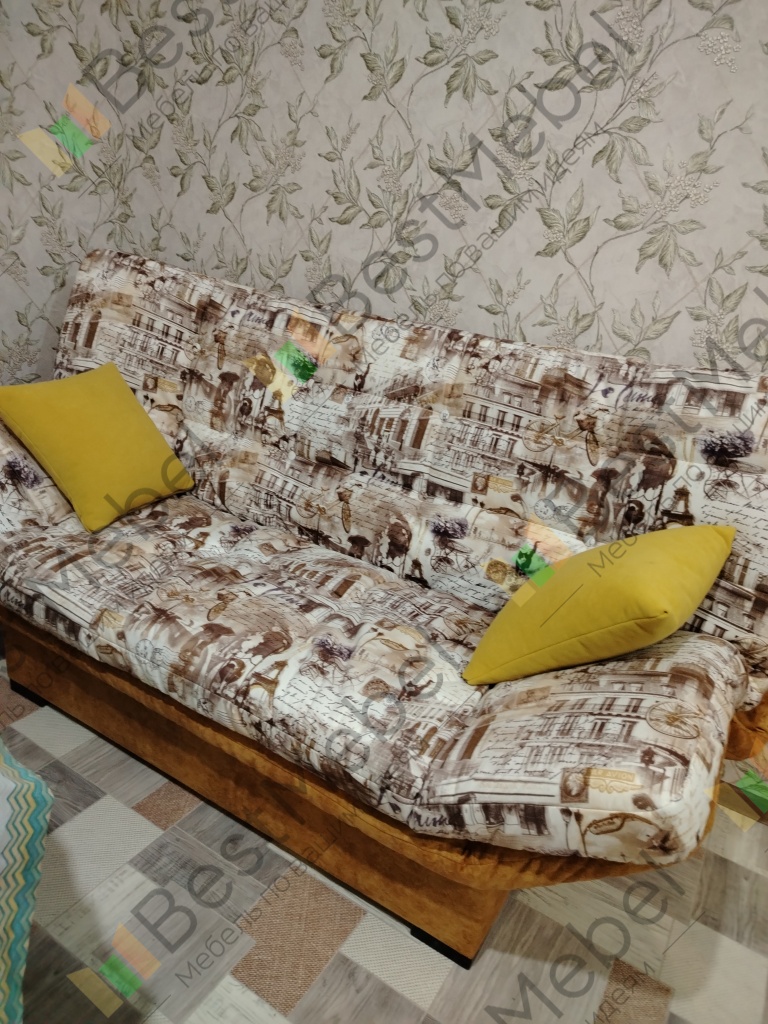 Мы выбрали пеструю обшивку и жёлтые подушки. Диванчик получился как картинка. Выглядит очень аккуратно, чехол можно снять. Легко раскладывается.