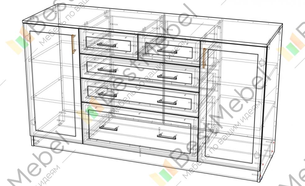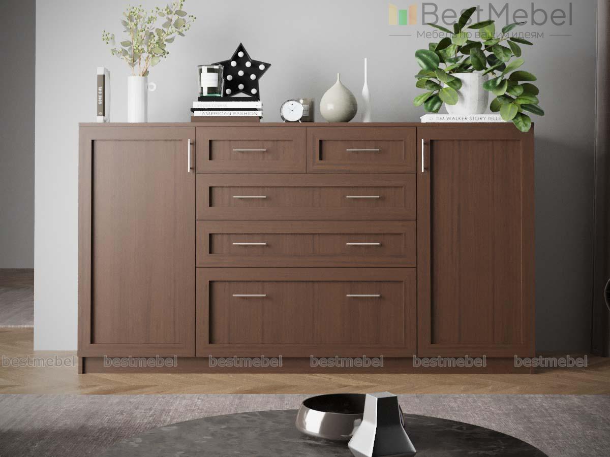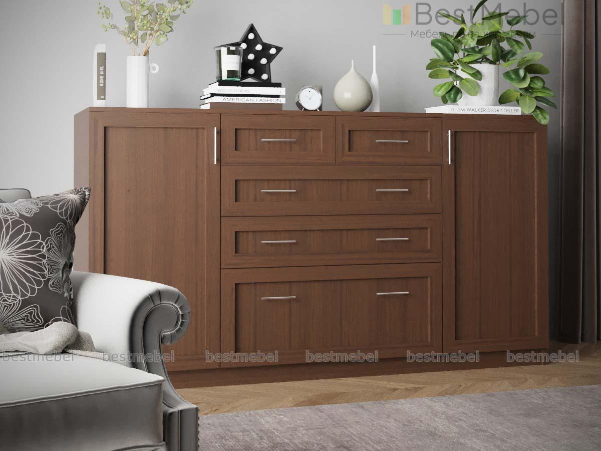 Комод Браво-11 можно назвать современным и качественным предметов обихода,который станет хорошей находкой для Вашего дома. Сочетание практичности и больших габаритов позволят разместить любое количество одежды и личных вещей. Комод включает в себя 2 маленьких и 3 больших ящика и отделения за распашными дверцами по бокам. В них Вы можете хранить любые предметы. Цвет изделия подбирается по Вашему желанию. Понравился комод? Купить его можно, зайдя на сайт нашего интернет-магазина.
