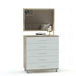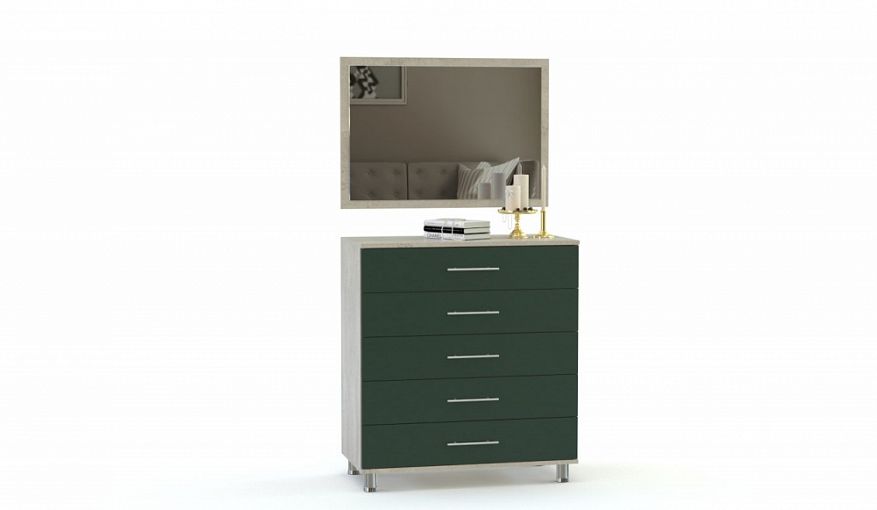 Комод Камелия 2 BMS отличается компактными размерами и трендовым сочетанием корпуса с имитацией поверхности бетона и цветного фасада. Дополнение в виде навесного зеркала позволяет использовать комод как туалетный столик, разместив на столешнице уходовые средства и аксессуары. Для удобного хранения одежды, постельного белья и бытовых вещей конструкцией предусмотрены пять выдвижных ящиков. Купить комод Камелия 2 BMS для современного спального интерьера вы сможете в нашем интернет-магазине.