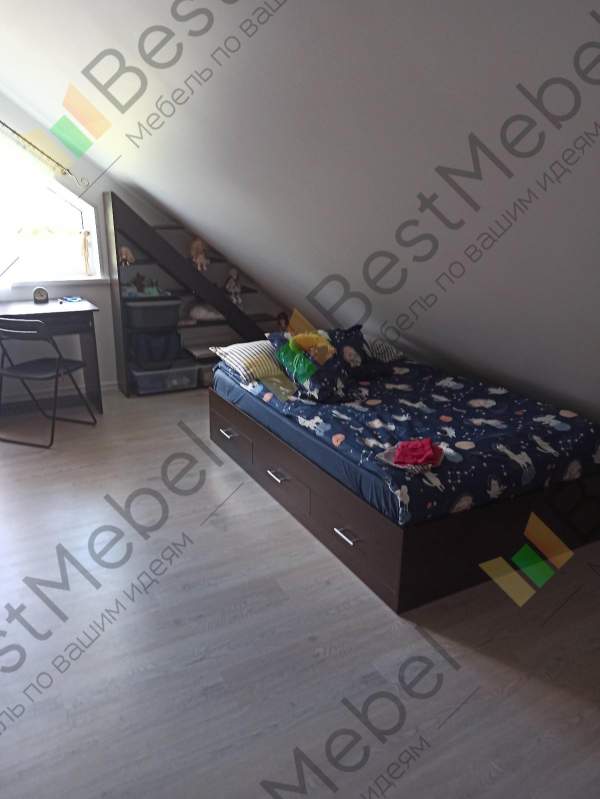 Кровать заказывала в детскую, с несурозным потолком. Не знала как вообще всё устрою, но стеллажи и кровать выручили. Получилась очень даже уютная детская. Внучка её любит.