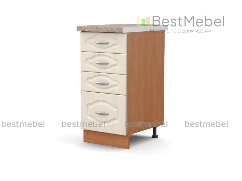 Шкаф-стол с 4-мя ящиками Рондо BMS добавит функциональности модульному комплекту для кухни. Классическая модель идеально подходит для хранения мелочей – три малых выдвижных ящика и один большой позволят держать все нужное под рукой и экономят время. Фасады ящиков декорированы легкой фрезеровкой и дополнены практичными ручками-скобами. Купить шкаф-стол с 4-мя ящиками Рондо BMS, подобрав подходящее цветовое решение, вы сможете недорого в нашем интернет-магазине.