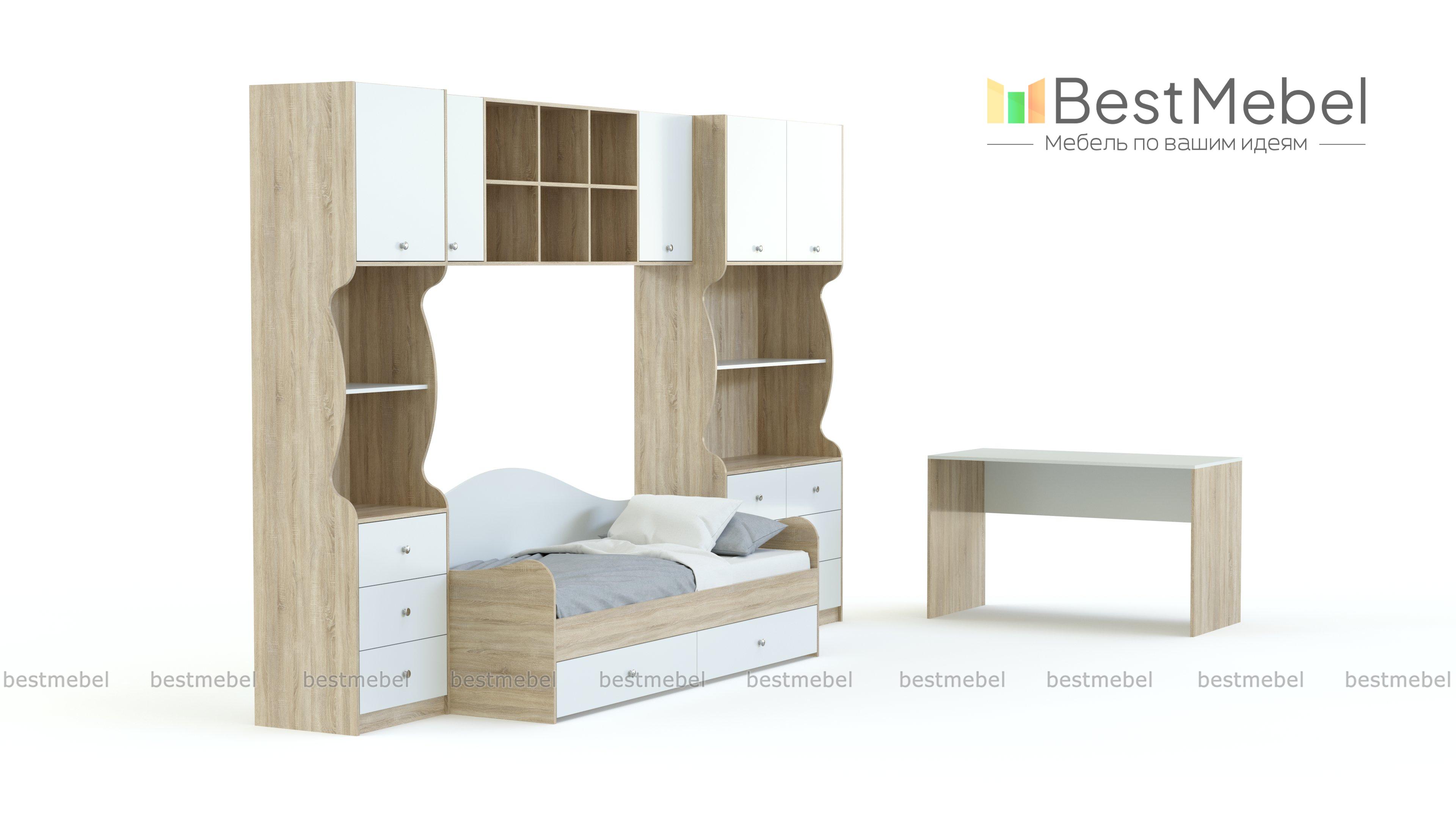 Детская Кирилл-2 BMS выполняется в нескольких оттенках и подойдет комнате как мальчика, так и девочки. Композиция объединила комбинированные стеллаж и шкаф, вместительную антресоль и кровать-тахту с бельевыми ящиками в основании. Продуманное сочетание модулей позволит оборудовать комфортную зону отдыха, компактно разместить большое количество вещей и сэкономить полезную площадь для игр. Износостойкие материалы станут залогом эстетичного вида и простоты ухода. Купить детскую Кирилл-2 BMS приглашаем в наш интернет-магазин.