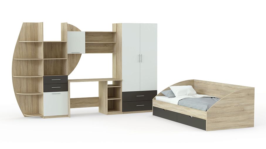 Детская комната Лето 1 BMS с фасадами в контрастных оттенках станет отличным выбором для комнаты подростка. В комплект входит все необходимое для полноценного сна, учебы и хранения вещей – кровать с бельевыми ящиками, распашной шкаф для одежды, компьютерный стол с навесными книжными полками, комбинированный шкаф и эффектный торцевой стеллаж. Износостойкие и простые в уходе, поверхности надолго сохранят эстетичный вид. Купить детскую комнату Лето 1 BMS приглашаем в наш интернет-магазин по доступной цене.