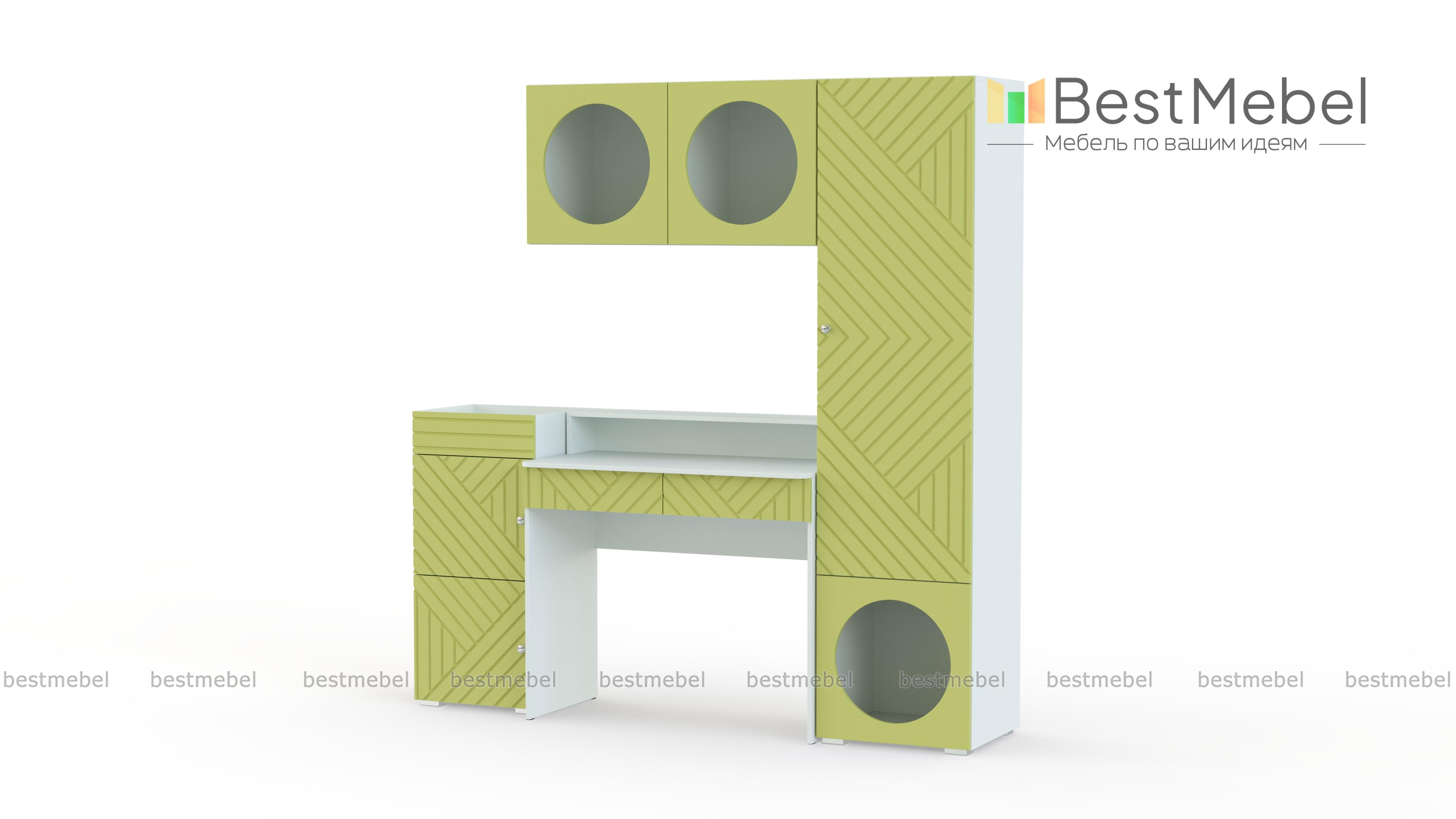 Детская стенка Авелин 6 BMS — это готовая рабочая зона с удобной системой хранения. Компактный столик с нишей дополняют два ящика для канцелярских мелочей и приставная тумба, а для книг, учебных пособий и личных вещей ребенка предусмотрены пенал и подвесная полка. Оригинальный дизайн с фрезерованными линиями и круглыми полками отражает модные тренды. Купить детскую стенку Авелин 6 BMS с возможностью выбора цвета и размеров приглашаем в наш интернет-магазин.