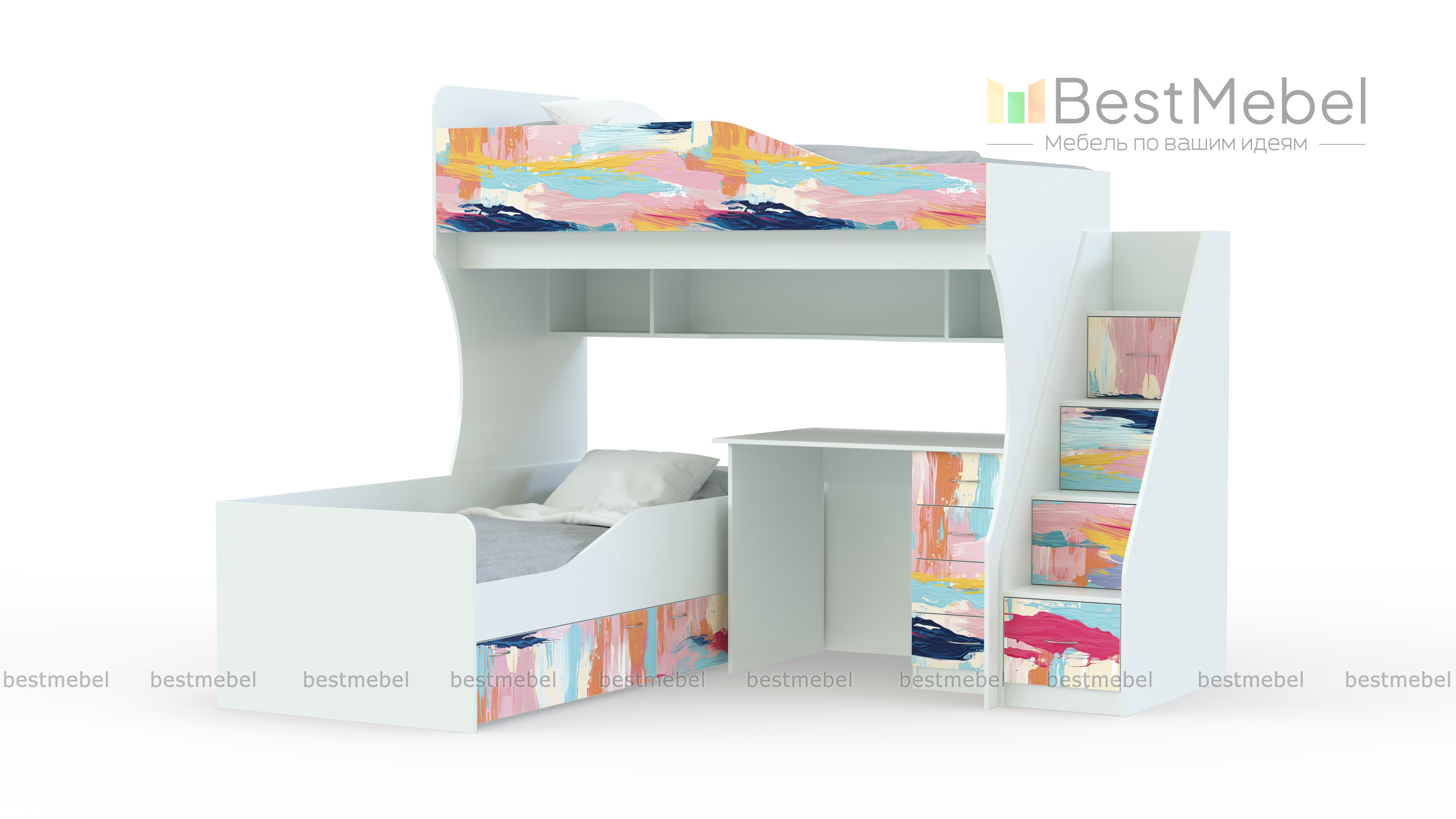 Двухъярусная кровать Дуэмо 5.1 BMS поможет рационально организовать пространство и освободить центральную часть детской для игр или спортивных занятий. Композиция состоит из двух расположенных перпендикулярно спальных мест, приставной лестницы-комода и рабочей зоны со столом, тумбой и книжными полками. Для хранения постельных принадлежностей в основании нижней кровати предусмотрены выдвижные ящики. Купить двухъярусную кровать Дуэмо 5.1 BMS приглашаем в наш интернет-магазин, подобрав оптимальное цветовое решение.