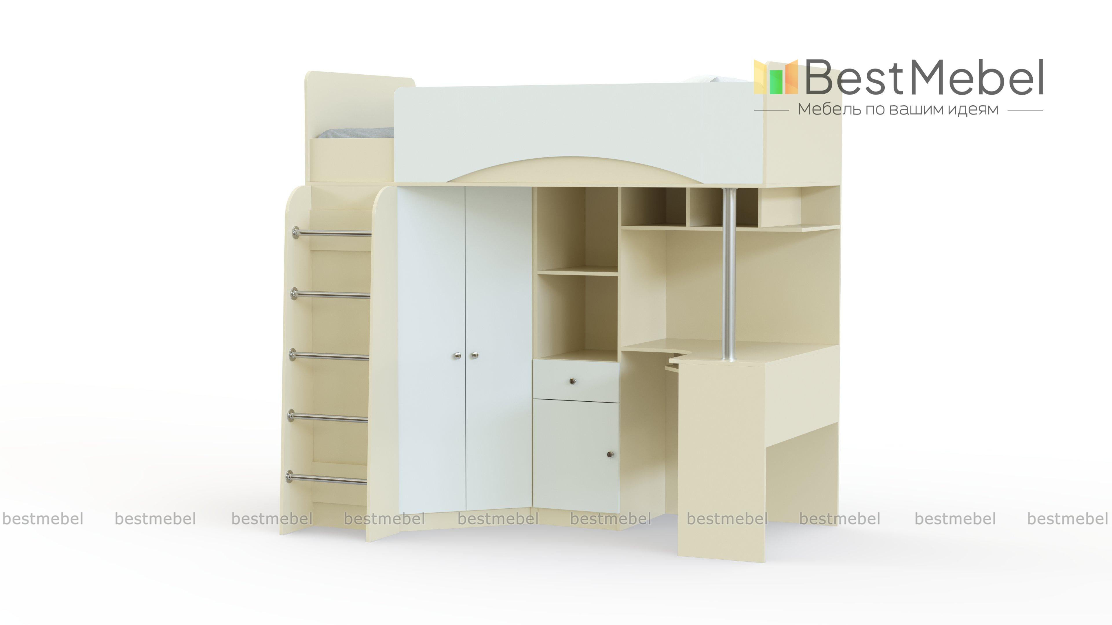 Кровать-чердак Бэмби-4 BMS позволит значительно сэкономить пространство, объединив спальное место с рабочей зоной и удобной системой хранения. На втором ярусе располагается комфортная кровать с защитными бортиками, а на первом – устойчивая лестница, распашной шкаф для одежды, угловой компьютерный стол с тумбой для канцелярских принадлежностей и открытые книжные полки. Универсальный дизайн и цветовое решение в светлых древесных тонах будет легко вписать в современные интерьеры. Купить кровать-чердак Бэмби-4 BMS приглашаем в наш интернет-магазин.