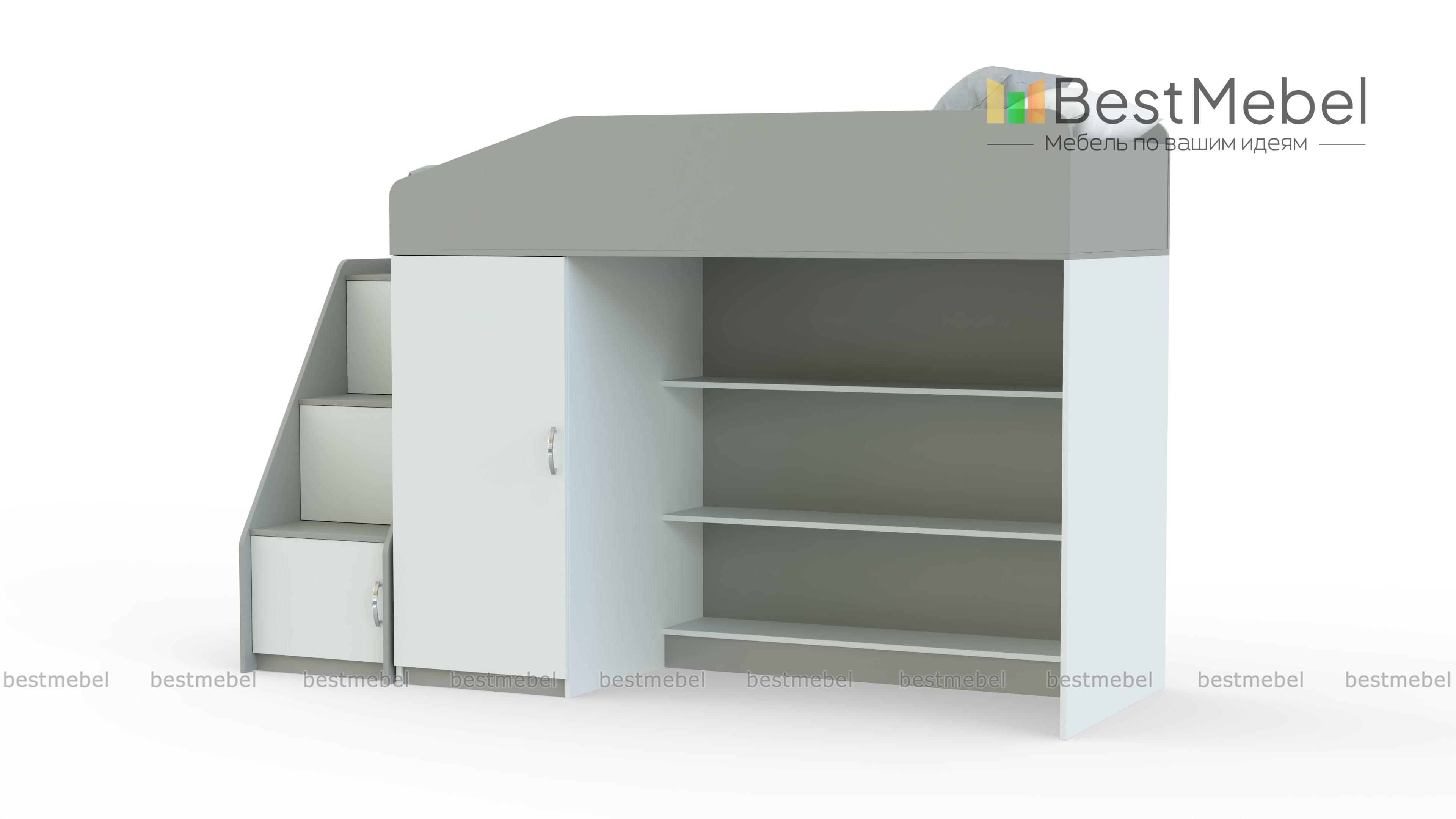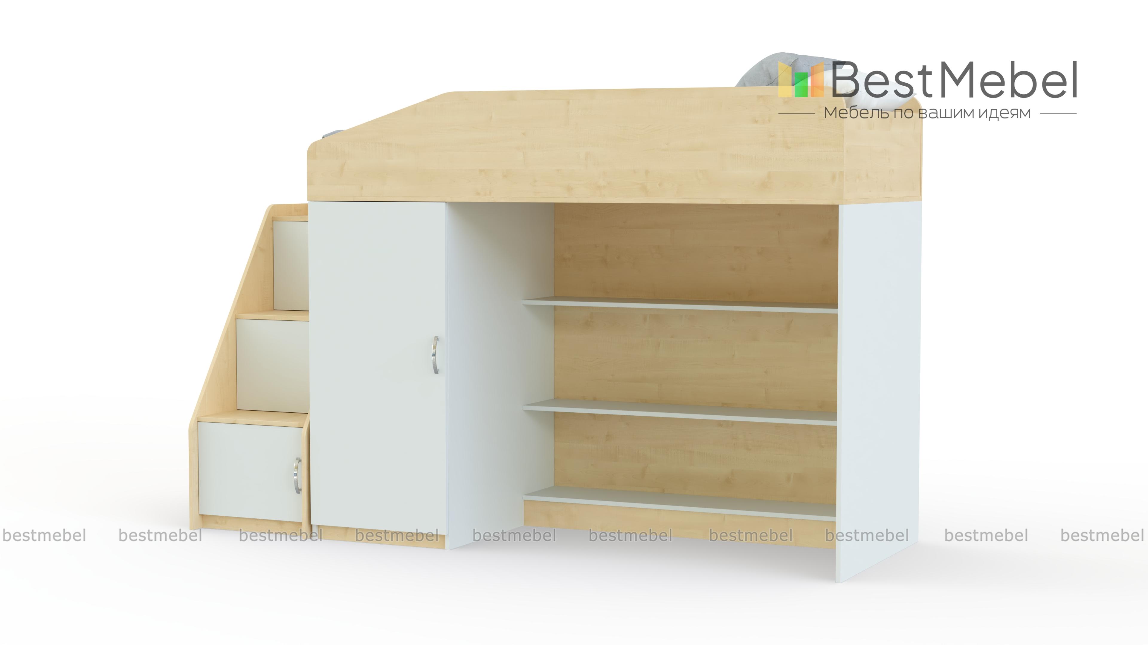 Кровать-чердак Миф-11 BMS отличается комбинированной конструкцией, незаменимой в современной малогабаритной детской. Яркая модель оборудована расположенной на втором ярусе кроватью с защитными бортиками и расположенными на первом распашным шкафом для одежды и просторными полками. Завершает композицию приставная лестница-горка с вместительными ящиками под ступеньками. Скругленные углы обеспечат безопасность пользования, а сочетание древесных тонов и белых элементов создаст позитивную атмосферу. Купить кровать-чердак Миф-11 BMS приглашаем в наш интернет-магазин.