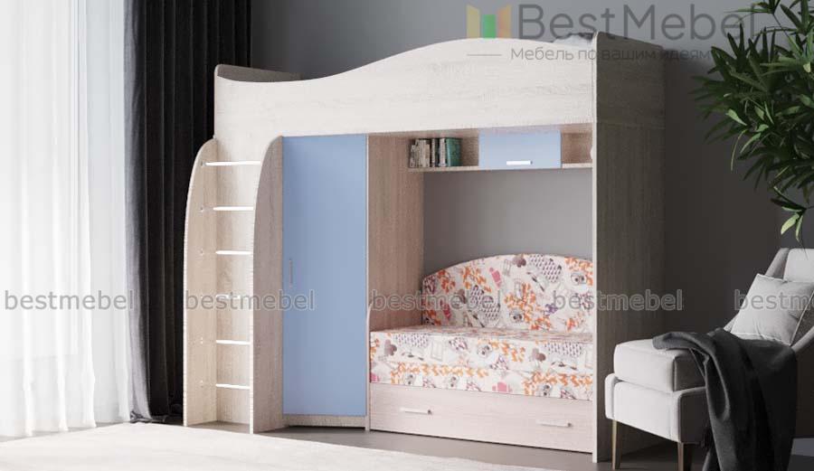 Кровать-чердак с диваном Фиона 7 BMS – это комфортная зона отдыха и удобная система хранения на минимуме пространства. На верхнем ярусе располагается спальное место с фигурным защитным бортиком, а на первом – встроенный платяной шкаф, книжная полка, мини-диван и лестница с хромированными перекладинами. Скругленные углы предметов станут залогом безопасности, а вписаться в интерьер детской поможет разнообразие цветовых решений. Купить кровать-чердак с диваном Фиона 7 BMS приглашаем в наш интернет-магазин.