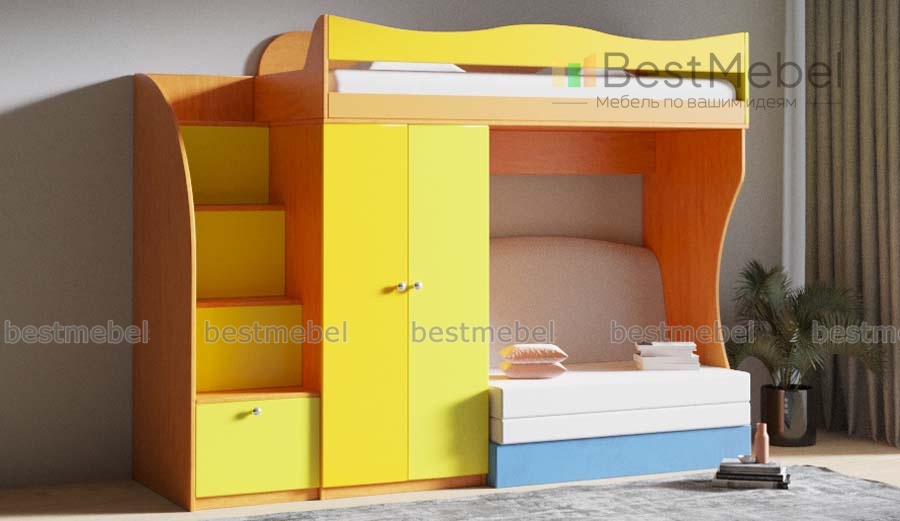 Кровать-чердак с диваном Мармелад 11 BMS отвечает всем требованиям, предъявляемым к мебели для детской. Двухъярусная композиция выполнена из экологичных материалов, практична и привлекает внимание ярким дизайном. На верхнем ярусе находится комфортное спальное место с волнообразно вырезанным бортиком, а на первом – распашной шкаф для одежды и раскладной мини-диван. Легко забраться в кровать поможет ребенку устойчивая и вместительная лестница-комод. Купить кровать-чердак с диваном Мармелад 11 BMS приглашаем в наш интернет-магазин.