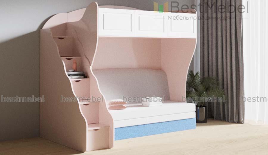 Кровать-чердак с диваном Василиса 1 BMS поможет оборудовать уютную комнату для девочки. Двухъярусная композиция выполнена в светлых тонах и украшена по фасаду фрезеровкой. На втором ярусе расположено комфортное спальное место с бортиком, на первом – ниша с диваном, а легко забраться в постель поможет ребенку лестница-комод с ящиками и фигурно вырезанными боковинами. Купить кровать-чердак с диваном Василиса 1 BMS приглашаем в наш интернет-магазин по отличной цене.