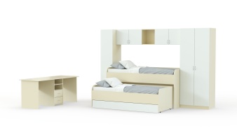 Мебель детская Мийа-2 BMS – недорогое и практичное решение для комнаты на двоих детей. Яркий дизайн мебели понравится школьникам, а взрослые оценят функциональность и надежность модели. В комплект входят двухсторонний письменный стол с тумбой посередине, кровать с дополнительным выдвижным спальным местом, пенал, навесная полка и двухдверный шкаф для одежды. Цветовое решение – корпус светлых ванильных оттенков и белые фасады. Купить мебель детскую Мийа-2 BMS, подобрав необходимые параметры, вы сможете в нашем интернет-магазине.