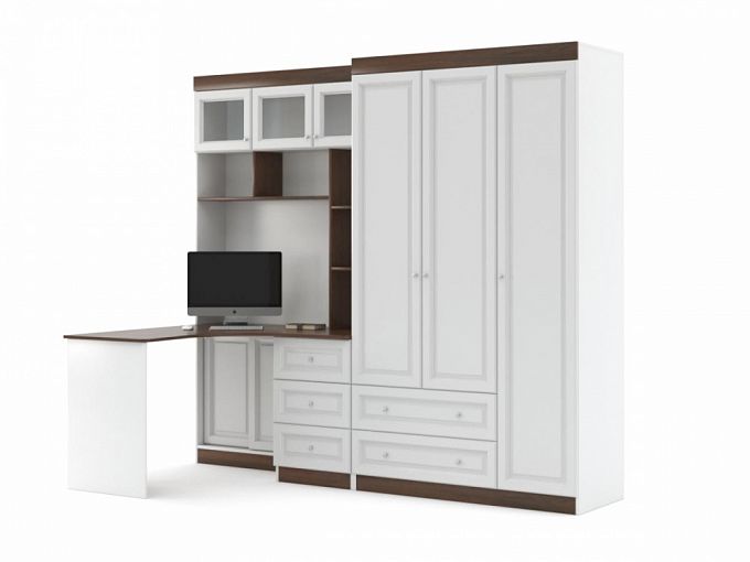 Шкаф со столом Классик 19 BMS объединил продуманную систему хранения и комфортную рабочую зону. Благодаря угловой конструкции вы сможете эффективно использовать пространство, а светлые фасады с рамочной фрезеровкой элегантно дополнят классический интерьер. Трехдверный шкаф для одежды дополнен модулем с открытыми и застекленными полками, тумбами для хранения канцелярских принадлежностей и письменным столом. Купить шкаф со столом Классик 19 BMS приглашаем в наш интернет-магазин.