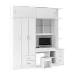 Шкаф со столом Марта 11 BMS будет особенно востребован в помещениях, где необходимо сэкономить пространство. Многофункциональная композиция объединила трехдверный шкаф для белья и одежды с выдвижными ящиками, антресоль-купе, компьютерный стол с открытыми книжными полками и ящиками для мелочей, банкетку и торцевую секцию с тумбой и радиусными полками. Исполнение в белом цвете придает шкафу визуальную легкость и делает помещение светлее. Купить шкаф со столом Марта 11 BMS приглашаем в наш интернет-магазин.