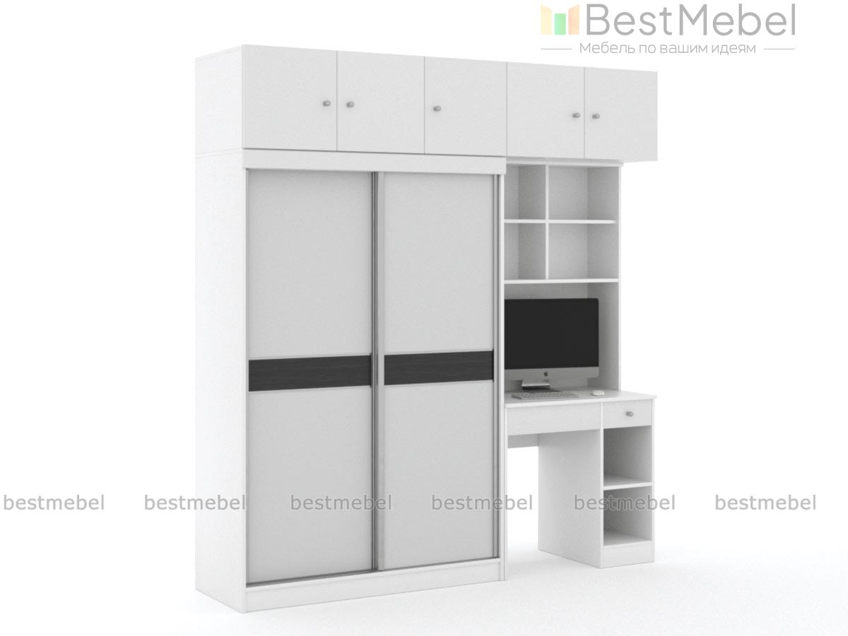 Шкаф со столом Октава 11 BMS гармонично впишется даже в интерьер небольших помещений и сэкономит пространство. Комбинированная модель объединила двухдверный шкаф-купе для одежды, вместительную распашную антресоль и компьютерный столик, дополненный книжными полками, нишей под системный блок и банкеткой. Выполненный в универсальном белом цвете, шкаф декорирован контрастной черной вставкой. Купить шкаф со столом Октава 11 BMS приглашаем на сайт нашего интернет-магазина.