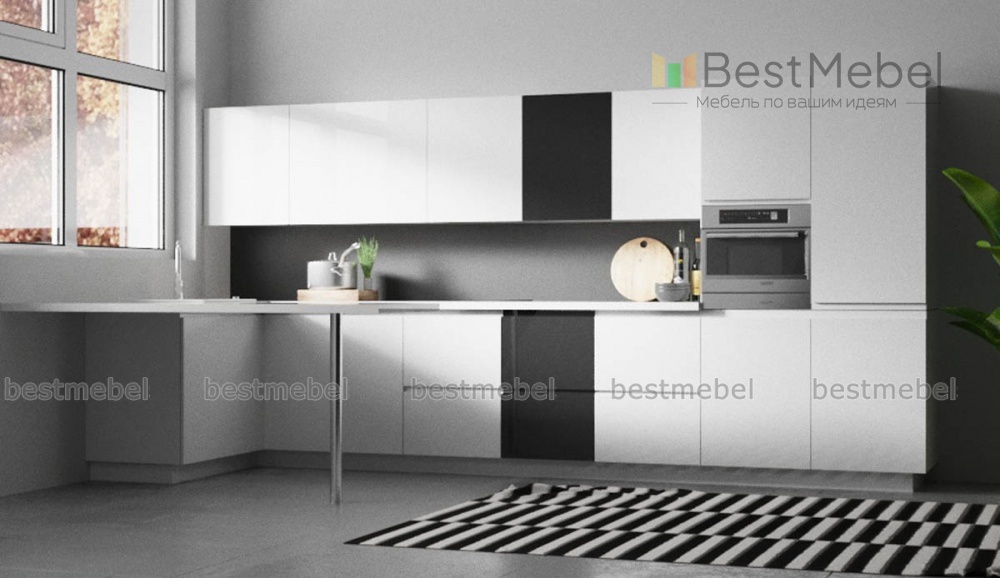 Кухня Ада-2 BMS поможет создать роскошный футуристичный интерьер в стиле минимализм или хай-тек. Белоснежные глянцевые фасады без ручек скруглены и дополнены контрастными черными акцентами. П-образная форма модели поможет максимально учесть особенности планировки, органично вписать бытовую технику, распашные и выдвижные системы хранения. Для зонирования предусмотрена барная стойка со скошенной боковиной. Дополнительное встроенное освещение по нижней границе навесных шкафов создаст особенную атмосферу, освещение не входит в стоимость комплектации. Купить кухню Ада-2 BMS приглашаем в наш интернет-магазин.