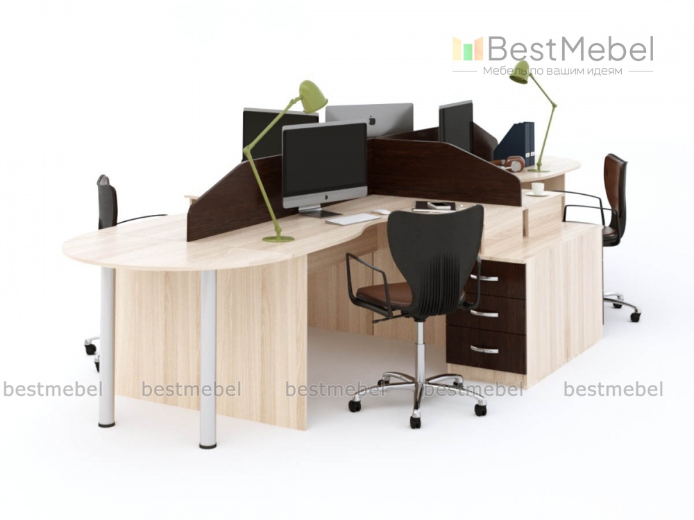 Бенч-система Мэтр BMS объединила в практичной композиции четыре угловых компьютерных стола, приставные тумбы с выдвижными ящиками для канцелярских мелочей и торцевые элементы с хромированными опорами. Система, выполненная в контрастных древесных тонах, гармонично впишется в современные интерьеры и оптимальна для просторных офисов открытого типа. Приватность рабочих зон обеспечат разделительные настольные перегородки. Купить бенч-систему Мэтр BMS вы сможете в нашем интернет-магазине по лучшей цене.