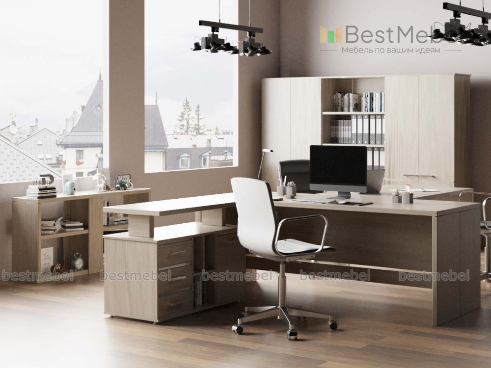 Кабинет руководителя Артос 2 BMS – прекрасный выбор для современного офиса, позволяющий создать легкий и комфортный интерьер. Модульный комплект включает в себя рабочий стол, дополненный брифингом и сервисной тумбой с полкой, низкий книжный стеллаж, шкаф для документов со стеклянными дверцами и гардероб. Лаконичные по форме и функциональные, предметы выполнены в светлых древесных тонах. Купить кабинет руководителя Артос 2 BMS приглашаем в наш интернет-магазин с учетом оптимальных параметров.