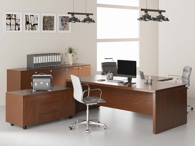 Кабинет руководителя Дуо 5 BMS позволит создать по-настоящему комфортный и функциональный интерьер. Модульный комплект включает в себя письменный стол с просторной рабочей поверхностью, дополненный приставным брифингом и мобильной широкой тумбой, а также распашную высокую тумбу. Выполненные в теплых древесных тонах, предметы сморятся респектабельно и надолго сохранят эстетичный вид благодаря материалам и фурнитуре высокого качества. Купить кабинет руководителя Дуо 5 BMS приглашаем в наш интернет-магазин.