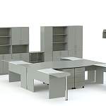 В комплект входит 5 шкафов, тумба, пенал и 4 стола с приставными конструкциями, две подвесные полки. Есть возможность компоновать между собой элементы по своему усмотрению, зависимо от площади кабинета и предприятия, где они будут использоваться.