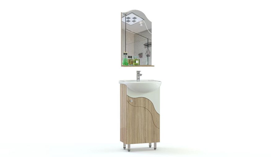 Комплект для ванной Фэст 2 BMS станет отличным вариантом для малогабаритных помещений, помогая создать легкий и функциональный интерьер. Композиция объединила однодверную напольную тумбу под раковину, оборудованную распашным отделением с полкой, и навесное зеркало с полочкой для мелочей. Волнообразно вырезанные фасады предметов выполнены в едином стиле, тумбу украшает оригинальная фрезеровка. Купить комплект для ванной Фэст 2 BMS приглашаем в наш интернет-магазин по доступной цене.