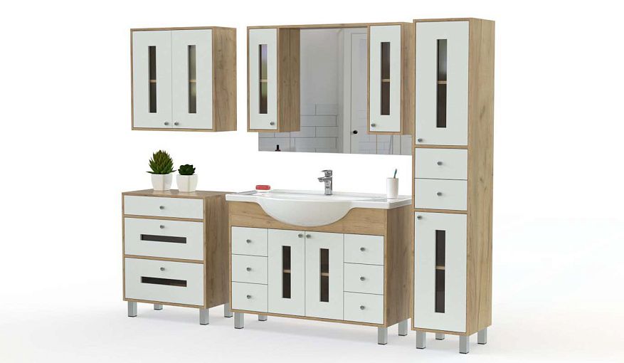 Комплект для ванной комнаты Прия 4 BMS предназначен для просторных помещений и отличается удобной системой хранения для уходовых средств, бытовой химии, банного текстиля. В комплекте широкая тумба под раковину с распашными и выдвижными отделениями, зеркало с подсветкой и шкафчиками для мелочей, тумба, навесной шкаф и высокий комбинированный пенал. Выполненные в сочетании древесного и универсальных белых тонов, предметы декорированы по фасаду стеклянными вставками. Купить комплект для ванной комнаты Прия 4 BMS вы сможете выгодно в нашем интернет-магазине.