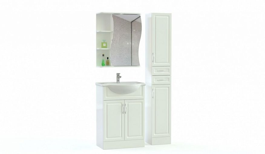 Комплект для ванной Лайн 4 BMS впишется даже в небольшие помещения и сделает их визуально просторнее. Композиция в современном классическом стиле включает в себя распашную тумбу под раковину, дополненный выдвижными ящиками пенал и навесной зеркальный шкаф с боковыми полочками и волнообразно вырезанным фасадом. Белоснежные фасады с фрезеровкой надолго сохранят эстетичный вид благодаря влагостойким поверхностям. Купить комплект для ванной Лайн 4 BMS с выбором цвета и фурнитуры вы сможете в нашем интернет-магазине.