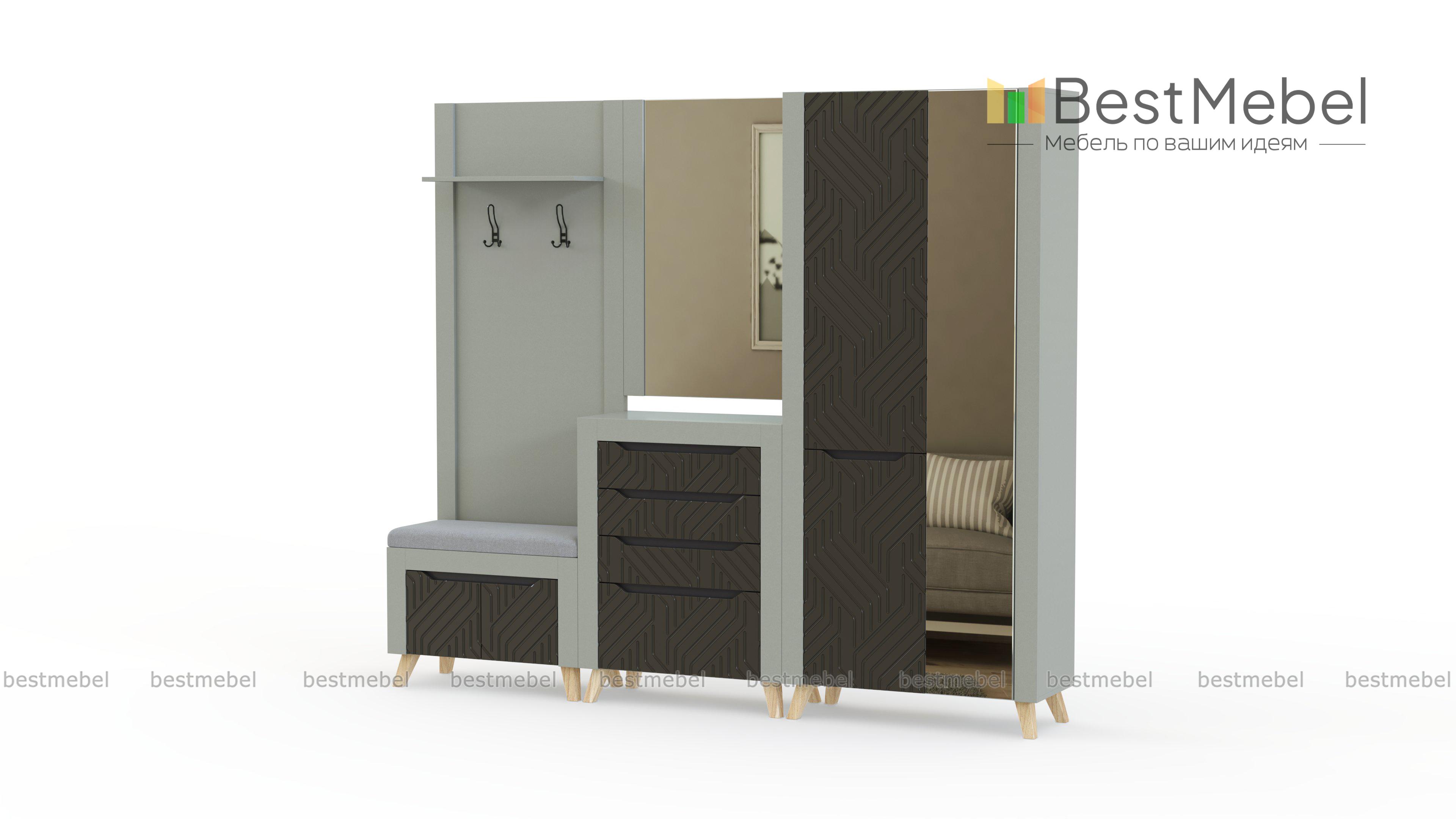 Прихожая Династия 20.3 BMS – стильное и функциональное решение для входной зоны. Нарочито простые модули с широкими накладками на фасадах не выглядят громоздко благодаря 3D фрезеровке и зеркалам, а модную геометричность дизайну придают трапециевидные ручки-вырезы. В комплект входят открытая вешалка, совмещенная с обувницей, распашной шкаф, комод и большое навесное зеркало. Купить прихожую Династия 20.3 BMS приглашаем в наш интернет-магазин с возможностью изготовления по индивидуальным размерам.