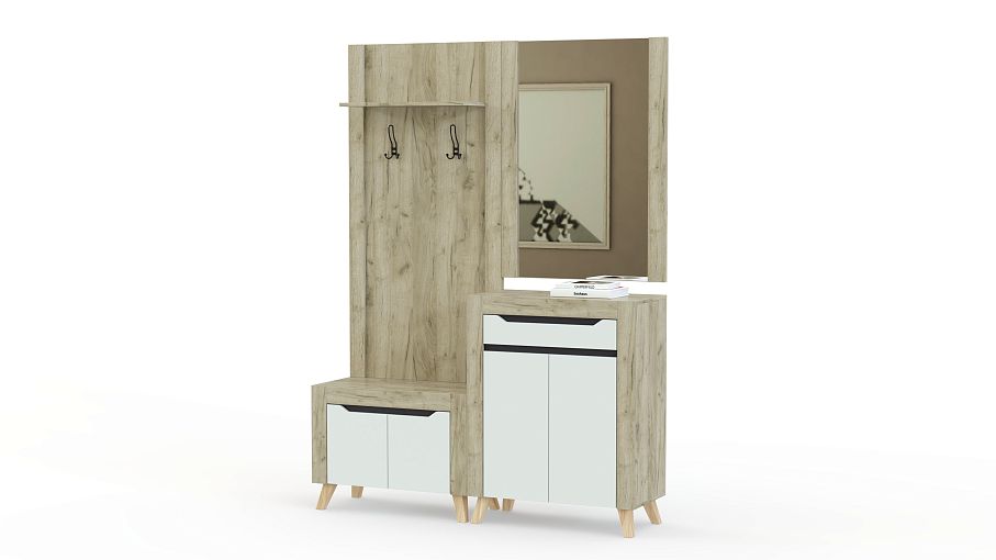 Прихожая Династия 20.4 BMS – стильное и функциональное решение для входной зоны. Нарочитую простоту модулей подчеркивают широкие накладки на фасадах и природные древесные оттенки, а роль декора играют трапециевидные ручки-вырезы. В комплект входят открытая вешалка, совмещенная с распашной обувницей, комод и большое навесное зеркало. Купить прихожую Династия 20.4 BMS приглашаем в наш интернет-магазин с возможностью изготовления по индивидуальным размерам.