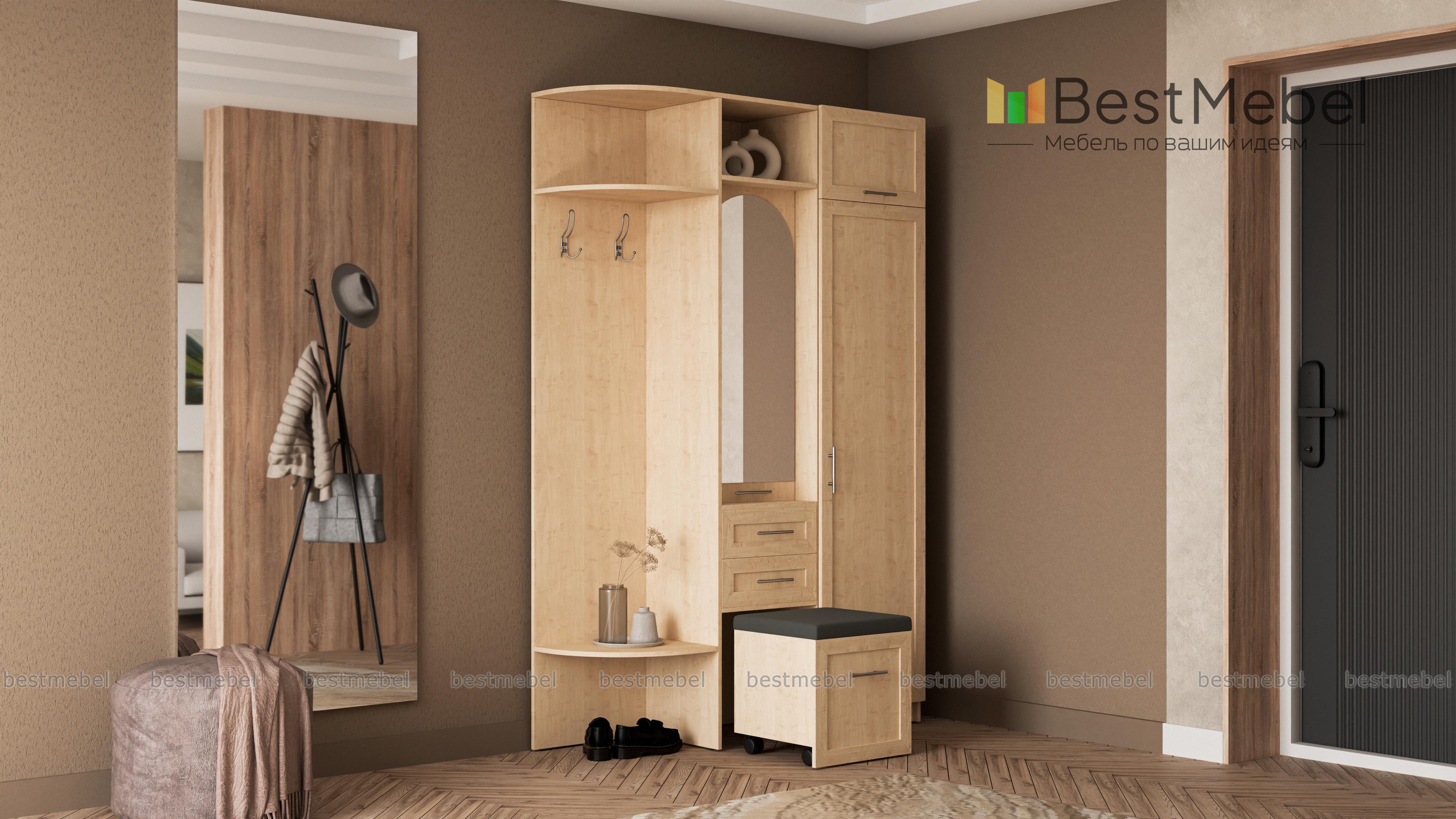 Прихожая Вика 1Б BMS с выкатным пуфом в мягкой обивке позволяет эффективно использовать пространство. Классическая композиция объединила пенал для одежды и антресоль, открытую вешалку со скругленными полками и большое, расположенное в нише зеркало, дополненное парой выдвижных ящиков. Широкие рамки на фасадах насыщенного древесного оттенка играют роль декора. Купить прихожую Вика 1Б BMS приглашаем в наш интернет-магазин с выбором фурнитуры и цвета по каталогу.