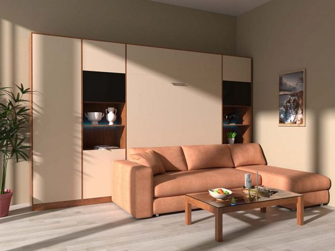 Шкаф-кровать с диваном Дино 7 BMS сочетает необходимые современной мебели высокую функциональность и актуальный дизайн. Стенка с удобной системой хранения компактно разместит большое количество вещей, а просторный угловой диван станет любимым местом семейного отдыха. Для трансформации в полноценную кровать модель дополнена модулем-трансформером с вертикальным механизмом подъема, простым и надежным в эксплуатации. Купить шкаф-кровать с диваном Дино 7 BMS и легко превратить гостиную в спальню вам поможет наш интернет-магазин.