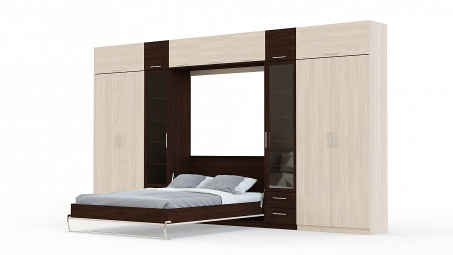 Шкаф-кровать трансформер Долли 48 BMS – интересное решение для организации пространства, которое поможет разгрузить помещение от лишней мебели. Крупногабаритная стенка включает в себя распашные шкафы для белья и одежды, застекленные пеналы с выдвижными ящиками в основании, вместительные антресоли и модуль с откидной кроватью. Комфортное спальное место подходит для ежедневного сна и в качестве гостевого варианта. Купить шкаф-кровать трансформер Долли 48 BMS и сэкономить полезную площадь вам поможет наш интернет-магазин.