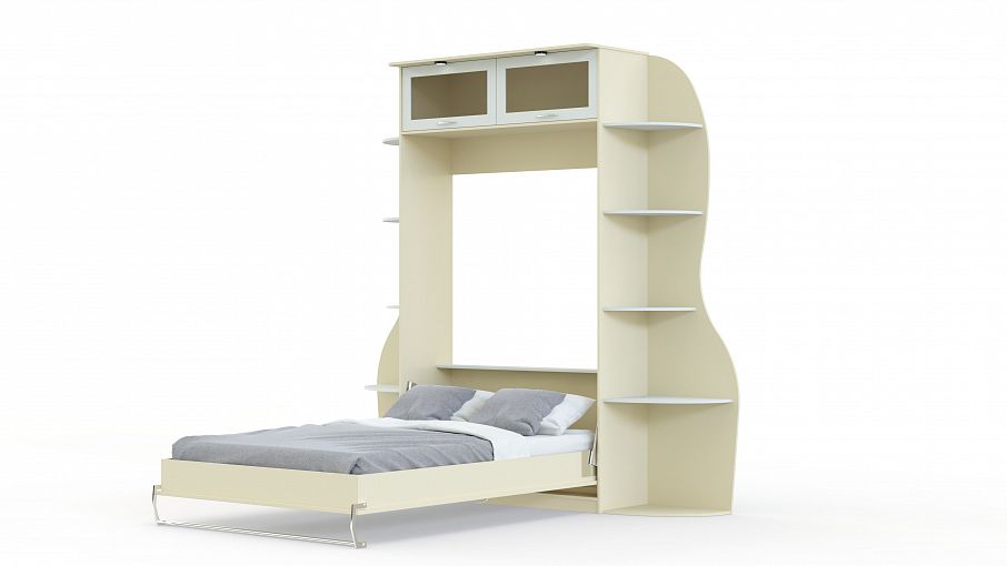 Шкаф-кровать трансформер Марио 41 BMS – это изящная современная мини-стенка, которая гармонично дополнит интерьер гостиной, а при необходимости легко превратит ее в уютную спальню. Модель оборудована антресолью с застекленными дверцами, открытыми торцевыми полками на фигурно вырезанных задних панелях и модулем с откидной кроватью, замаскированной под дверцы. При помощи простого и надежного вертикального механизма спальное место опускается вниз. Купить шкаф-кровать трансформер Марио 41 BMS выгодно приглашаем к нам в интернет-магазин.