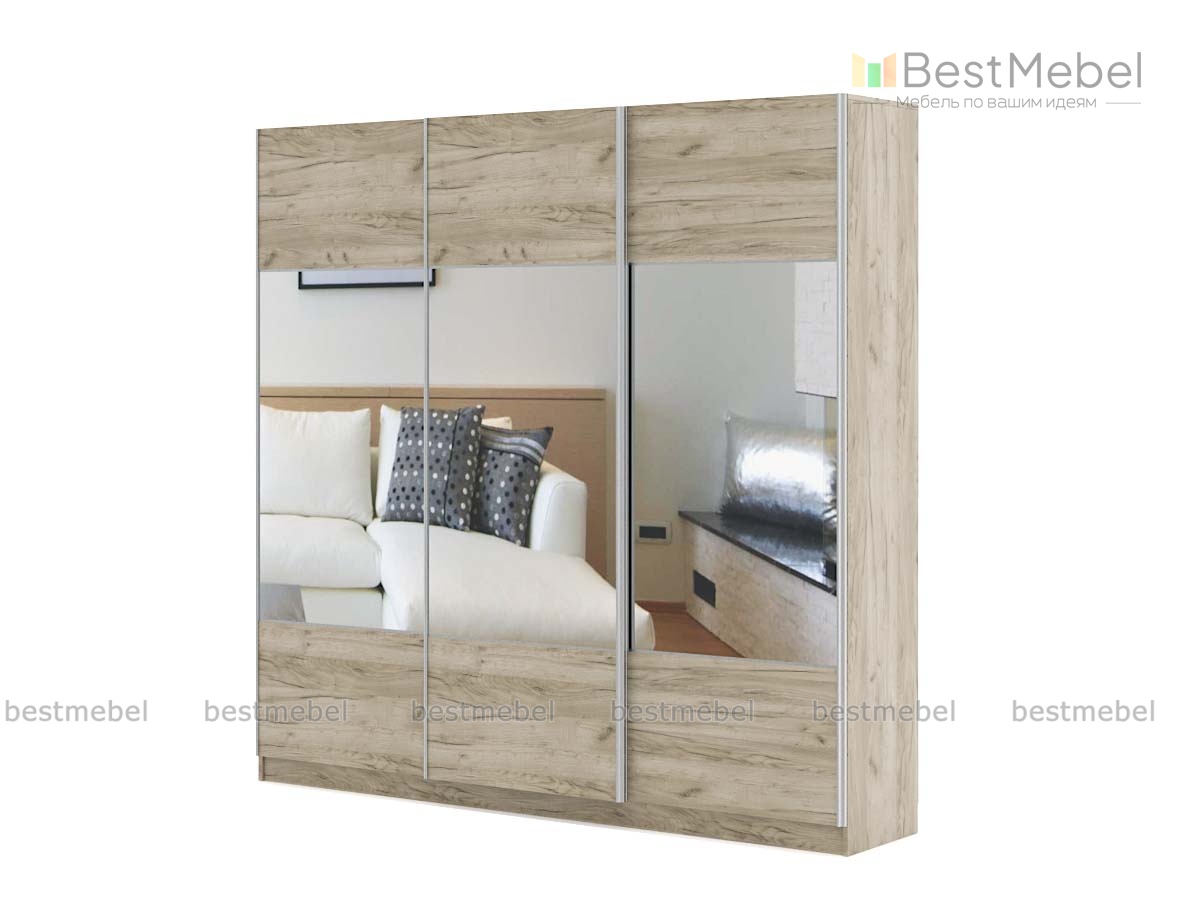 Данная модель отличается современным внешним видом и продуманной компоновкой. Фасад шкафа оформлен тремя дверями-купе, которые позволяют легко и комфортно размещать одежду. Все двери имеют единое оформление в виде центральной зеркальной вставки. Она визуально объединяет фасад и расширяет функциональные возможности шкафа. Использование в декоре зеркала - продуманное и современное решение, т.к. оно увеличивает количество света в комнате и создает комфортную обстановку. Уже в стандартном оформлении данная модель имеет приятный цвет корпуса и фасадов. Такой шкаф отлично впишется в современный интерьер и станет его стильным дополнением.