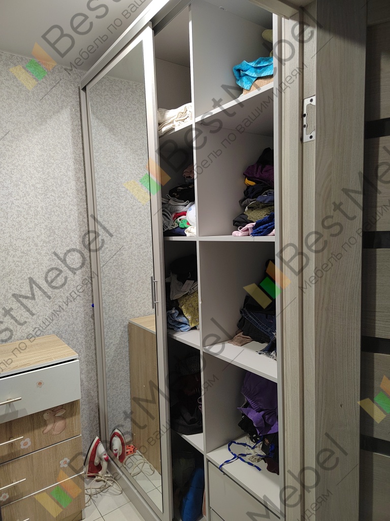 Качество на высоте , учтены все пожелания . Слегка ограниченный доступ к третьему ряду полок это было задумано , особенность помещения (не большая квадратура ). Шкаф по максимуму вместил в себя вещей