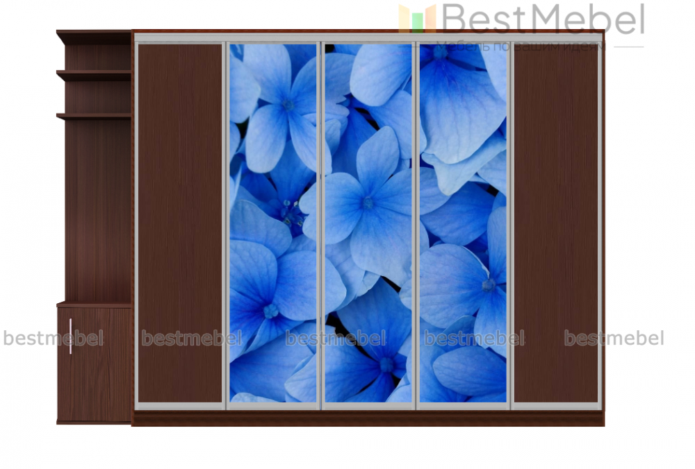 Шкаф-купе Гортензия 30 BMS - визуально легкий и нежный с изящной цветочной фотопечатью, станет украшением спального интерьера, гостиной, прихожей. Многофункциональная конструкция позволяет компактно хранить одежду и обувь, аксессуары и бытовые вещи. Помимо пятидверного шкафа композиция включает в себя модуль с двумя верхними полками и распашной тумбой. Купить шкаф-купе Гортензия 30 BMS приглашаем в наш интернет-магазин с выбором фурнитуры и цвета по каталогу.