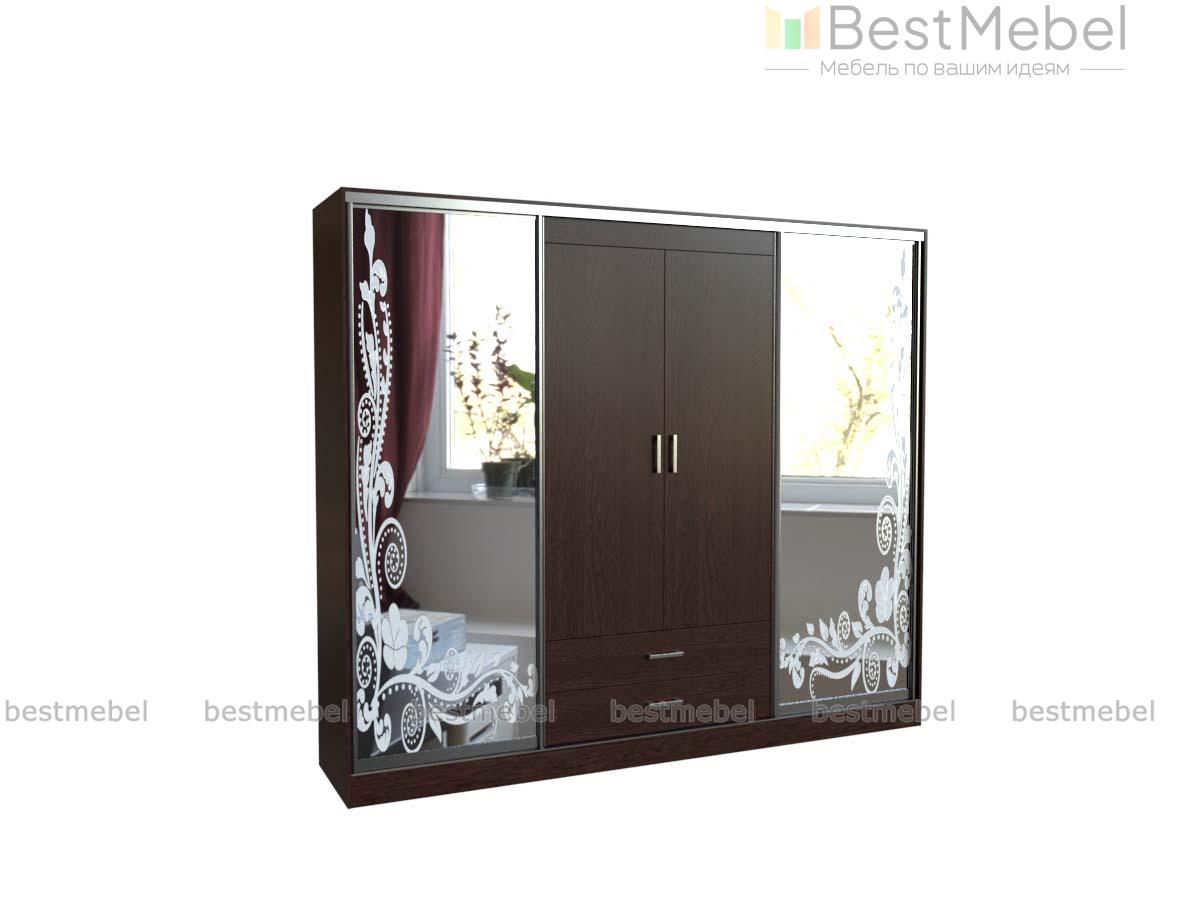 Шкаф-купе Лорд 1.3 BMS гармонично сочетает достоинства современных и классических моделей. Комбинированная конструкция позволяет организовать удобное хранение одежды, обуви, разнообразных аксессуаров и домашнего текстиля. Шкаф оборудован двумя раздвижными отделениями и центральной распашной секцией, дополненной двумя широкими выдвижными ящиками в основании. Зеркальные фасады отделений-купе декорированы изящным пескоструйным рисунком. Купить шкаф-купе Лорд 1.3 BMS для спальни или гостиной приглашаем в наш интернет-магазин.