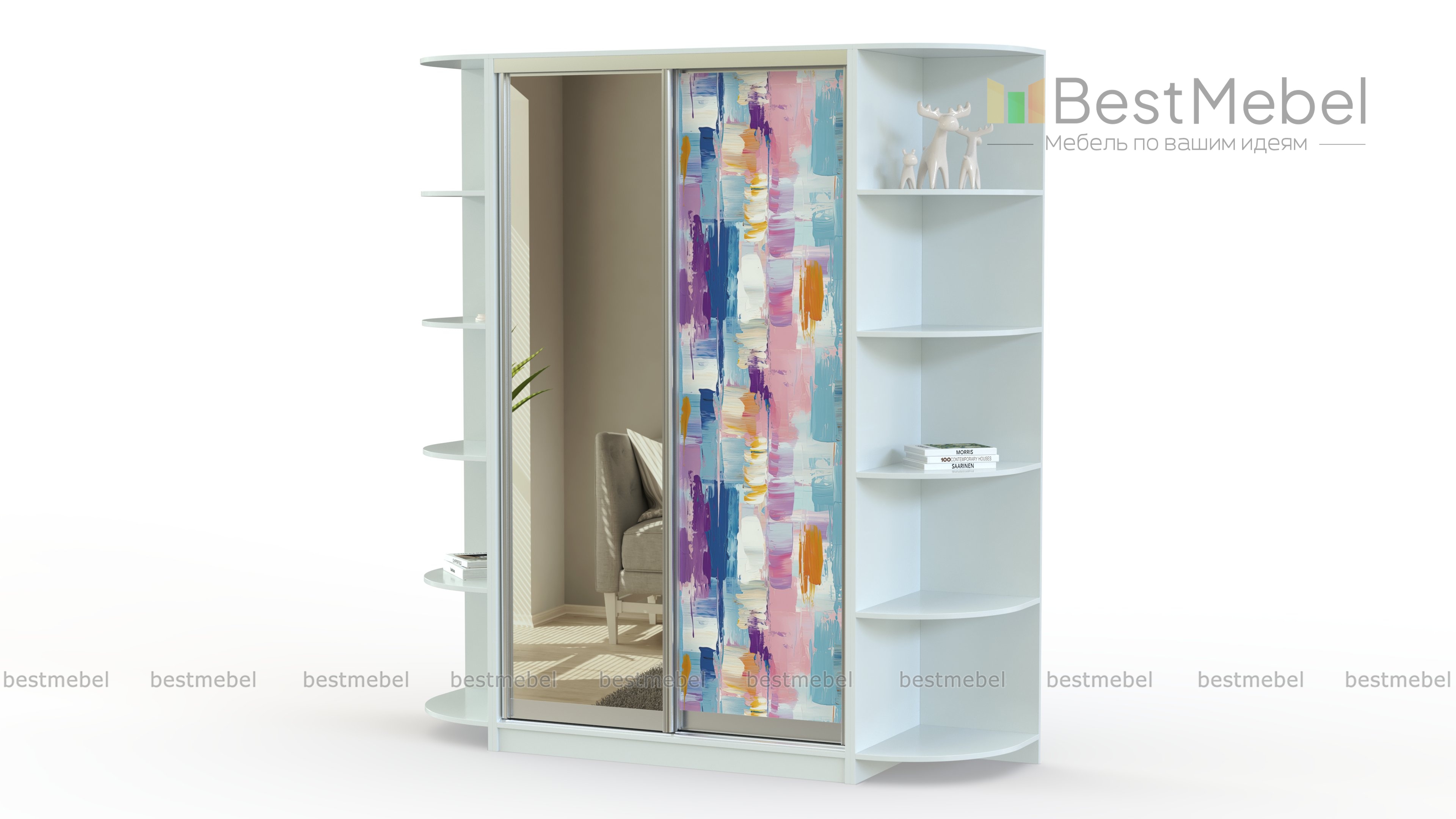 Шкаф-купе Марко 9 BMS – для тех, кто ценит в мебели минимализм и функциональность. Стильный и лаконичный, двухдверный шкаф имеет универсальную светлую базу и конструкцию с симметричными торцевыми стеллажами. Зеркальное полотно в оформлении фасада скомбинировано с яркой цветной абстракцией-фотопечатью. Купить шкаф-купе Марко 9 BMS для хранения одежды, обуви, уходовых средств, книг и приятных мелочей вы сможете недорого на сайте нашего интернет-магазина.