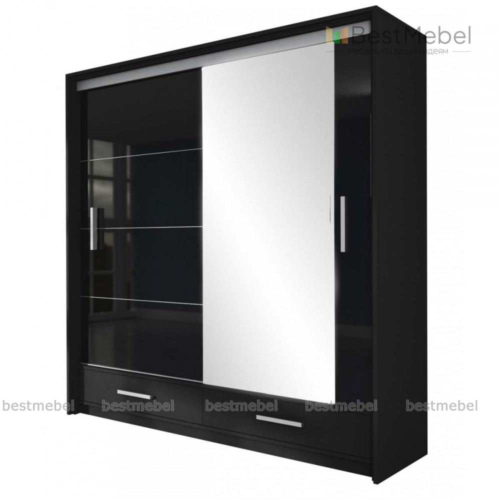Внутреннее наполнение шкафа-купе – это 2 просторных отделения со штангами, 7 ниш для одежды разного размера и 2 вместительных выдвижных ящика. Здесь найдется место для Вашей обуви, вещей, аксессуаров, коробок и много другого. Дополнительно, шкаф может быть оснащен светодиодной подсветкой.