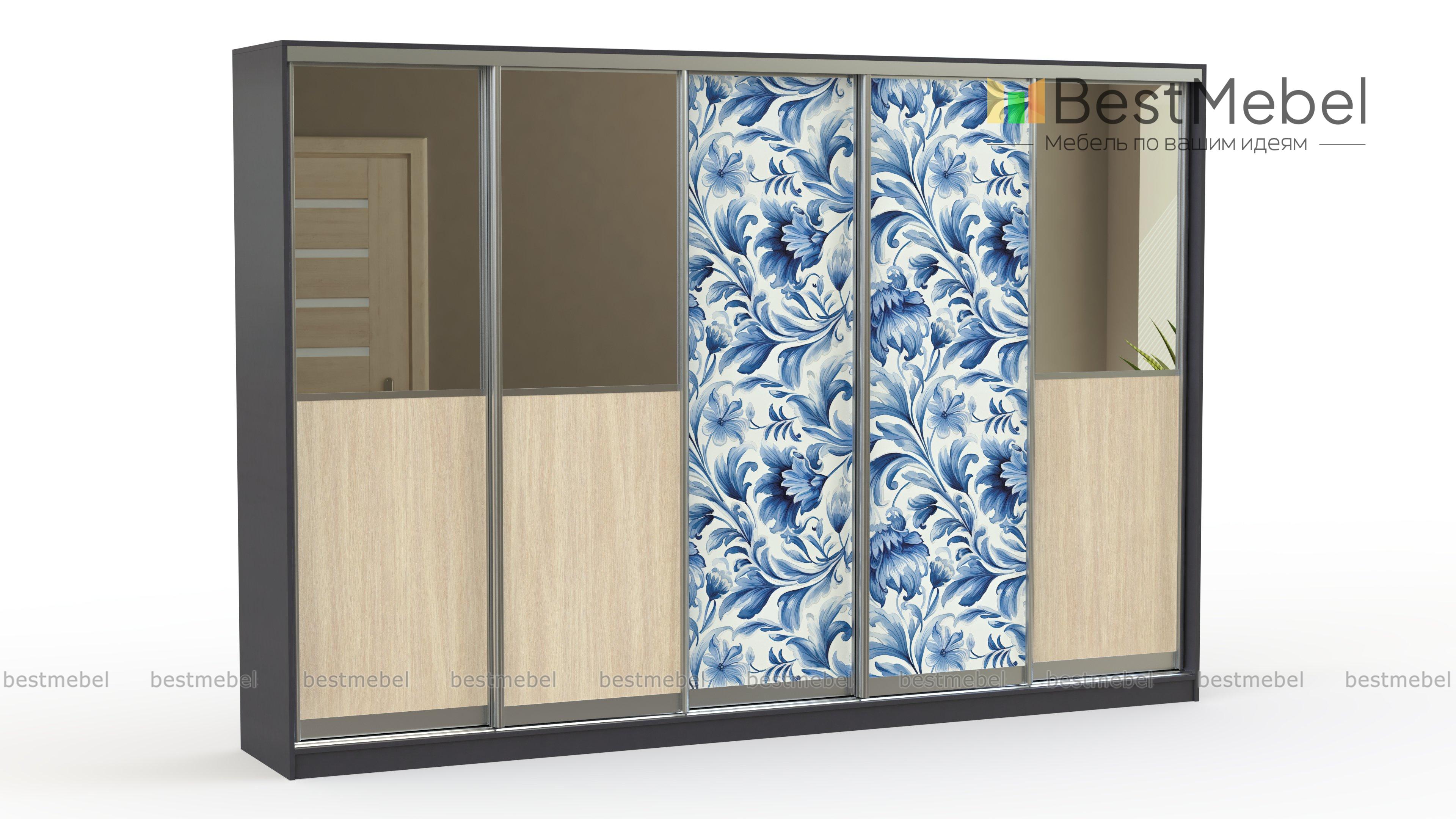 Шкаф-купе Мираж 9 BMS с акцентным фасадом станет прекрасным выбором для создания комфортного и эстетичного пространства. Строгий геометричный дизайн с древесными вставками и зеркалами разбавляет изящная фантазийная фотопечать. Особенную вместительность пятидверной конструкции обеспечивают просторные внутренние отсеки, оснащенные бельевыми полками и платяными штангами. Купить шкаф-купе Мираж 9 BMS вы сможете в нашем интернет-магазине, подобрав размеры и цветовое решение по своему вкусу.