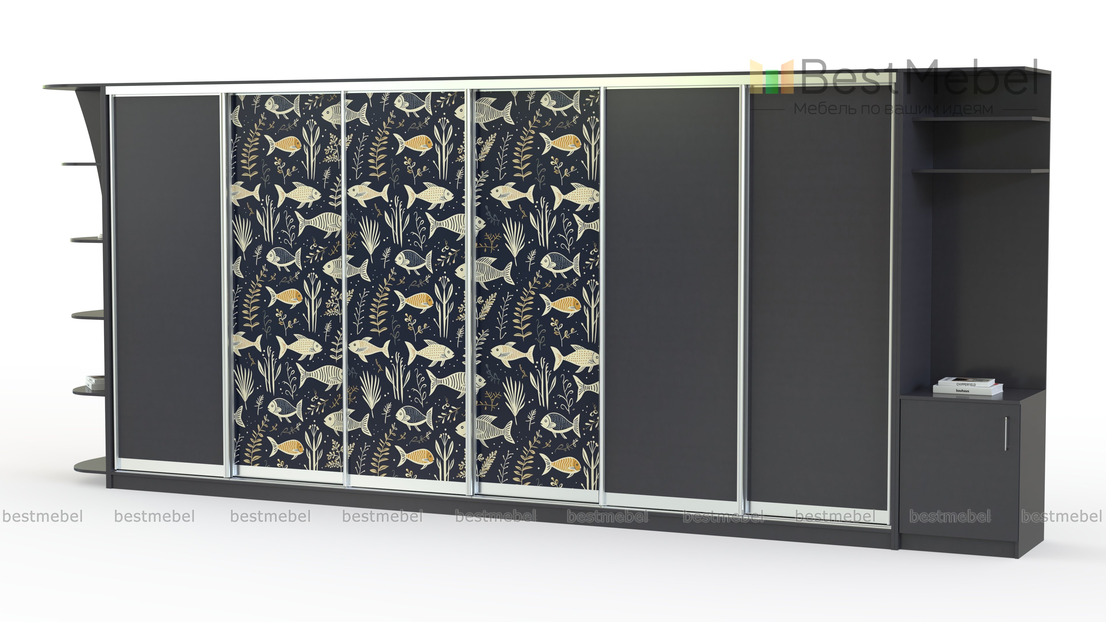 Шкаф-купе Море 31 BMS создан для меблировки просторных комнат, полностью занимая одну из стен. Контрастный «морской» принт эффектно смотрится на темном фоне, добавляя в интерьер стильный акцент. Многофункциональный шкаф, оборудованный шестидверным гардеробным отделением, книжным стеллажом и модулем с полками и тумбой, заменяет сразу несколько предметов меблировки. Купить шкаф-купе Море 31 BMS и рационально организовать пространство вам всегда поможет наш интернет-магазин.