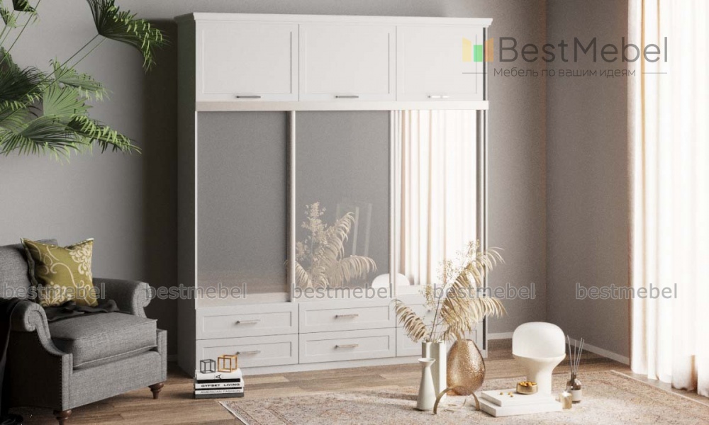 Шкаф-купе Нэмо 6 BMS особенно вместителен благодаря разноплановым отделениям и легко вписывается в интерьер благодаря разнообразию цветовых решений. Комбинированная модель оборудована шестью выдвижными ящиками в основании, трехдверным отделением-купе для белья и одежды и антресолью с откидными вверх дверцами для хранения сезонных вещей. Зеркальный фасад удобен для примерок и придает помещению дополнительную глубину. Купить шкаф-купе Нэмо 6 BMS выгодно вы сможете в нашем интернет-магазине.