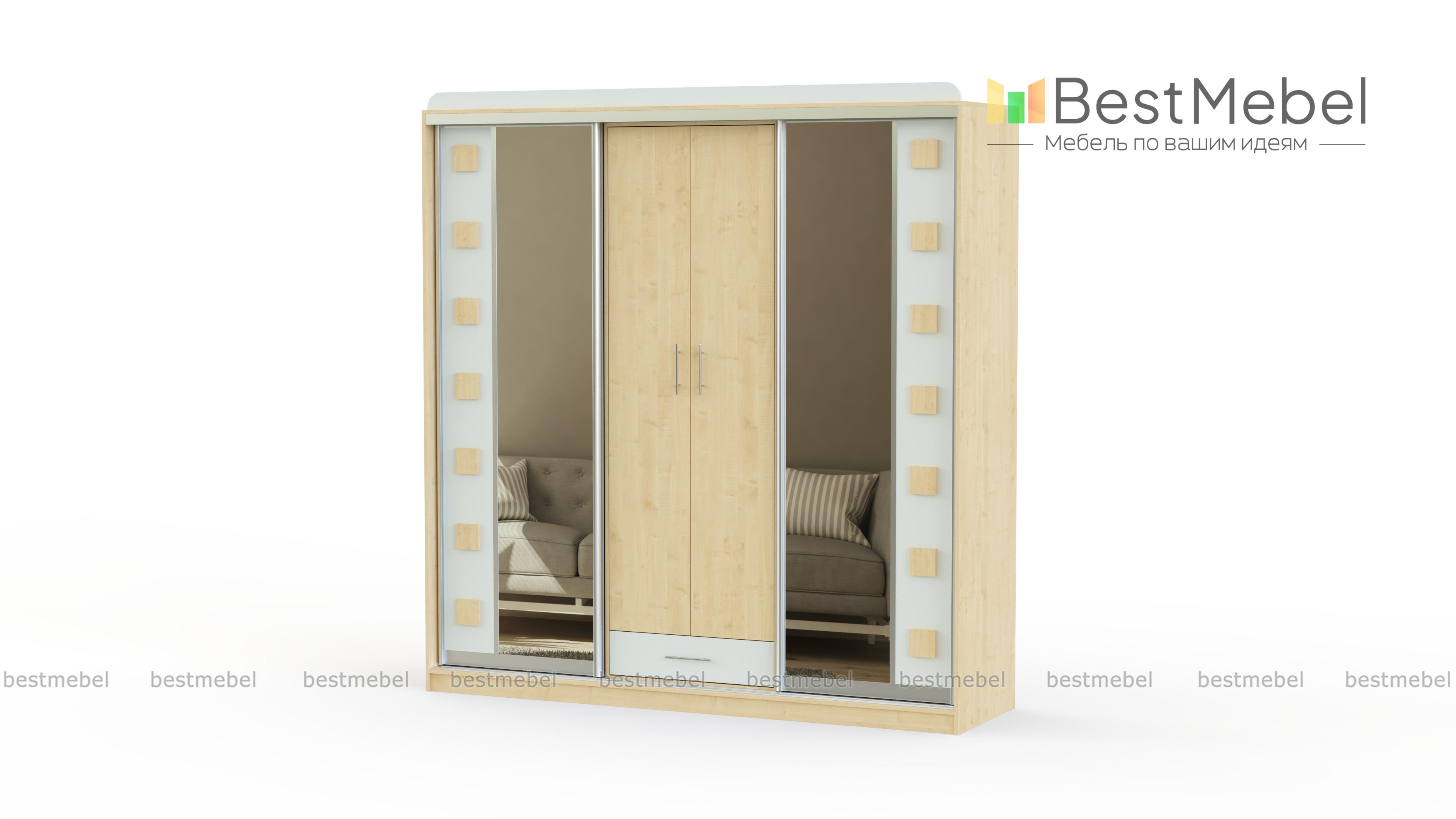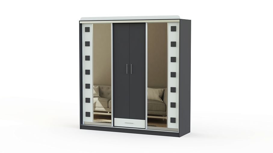 Шкаф-купе София BMS имеет комбинированную конструкцию, которая обеспечивает разные варианты хранения. Двухдверная распашная секция в центре дополнена выдвижным ящиком для мелочей и боковыми отделениями с раздвижными створками. В отделке фасадов шкафа использованы ламинированная плита темного оттенка, зеркала и квадратные декоративные вставки. Купить шкаф-купе София BMS вы сможете в нашем интернет-магазине с выбором размеров, цвета и компоновки.