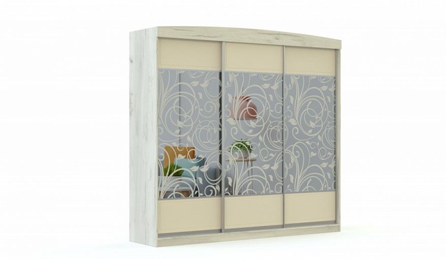 Шкаф-купе СП-515 BMS с корпусом в светлых древесных тонах и фрезерованным бежевым фасадом дополнен зеркалами, украшенными фантазийным рисунком. Вместительная, но при этом визуально легкая трехдверная модель гармонично впишется в спальные интерьеры и решит проблему хранения одежды и домашнего текстиля. Благодаря раздвижной конструкции створки не требуют свободного пространства для открывания и экономят полезную площадь комнаты. Купить шкаф-купе СП-515 BMS с учетом оптимальных размеров вы сможете в нашем интернет-магазине.