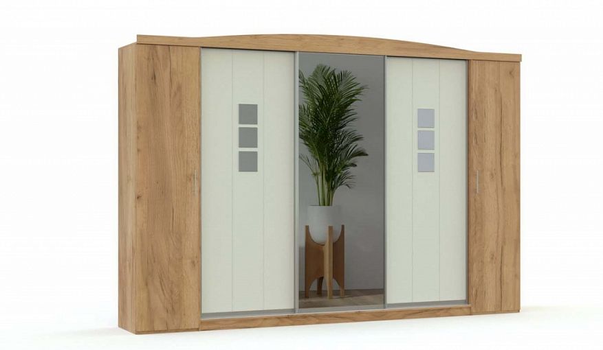 Шкаф-купе Техно 3 BMS станет практичным выбором для меблировки просторных помещений. Крупногабаритная модель имеет комбинированную конструкцию, объединившую трехдверное отделение-купе и распашные боковые секции. Вы сможете компактно разместить гардероб и постельные принадлежности, а украшением интерьера станет оригинальный декор фасада, в оформлении которого скомбинированы ЛДСП теплого крафтового оттенка, стекло и зеркала. Купить шкаф-купе Техно 3 BMS с учетом необходимых размеров приглашаем в наш интернет-магазин.