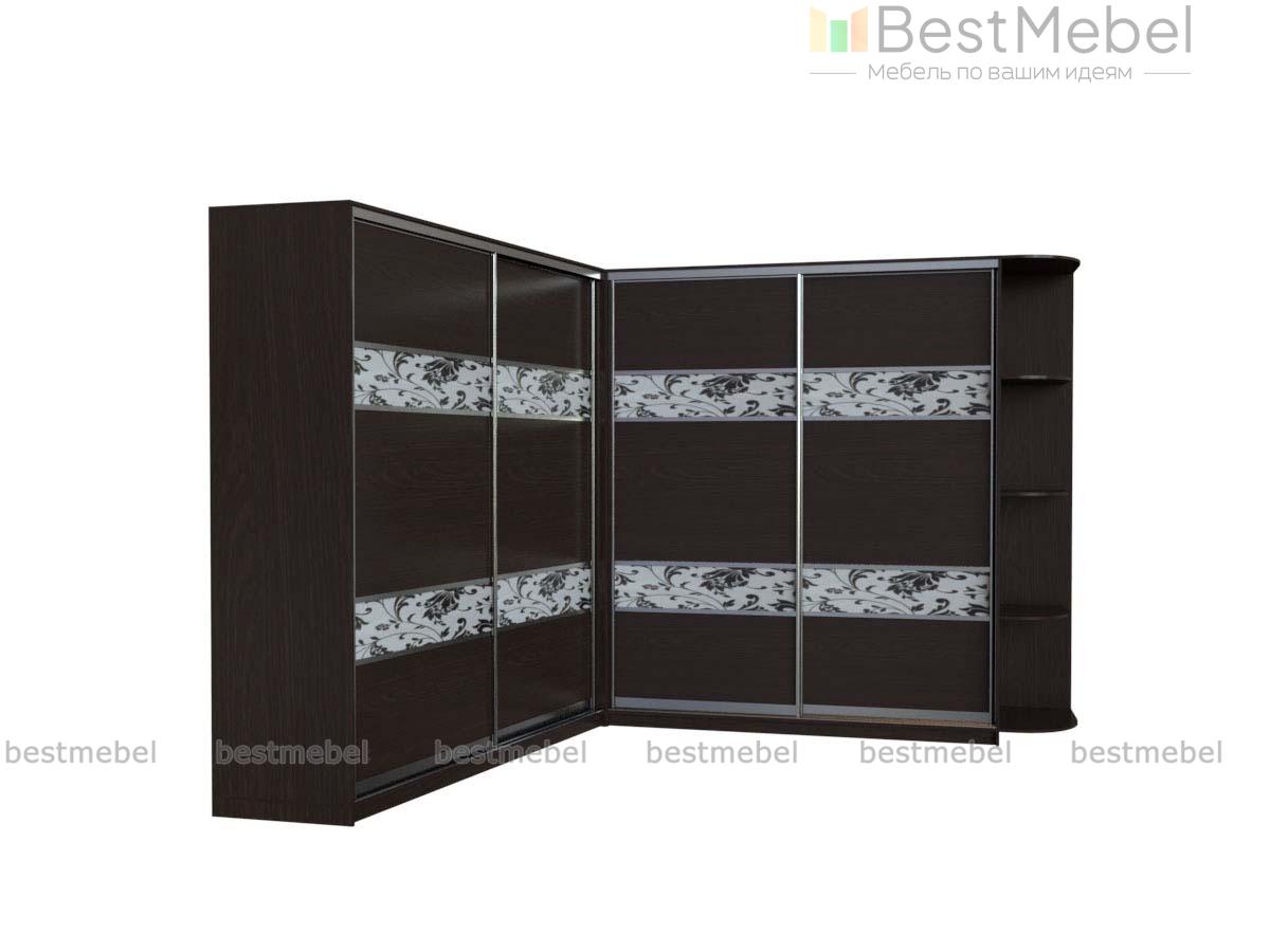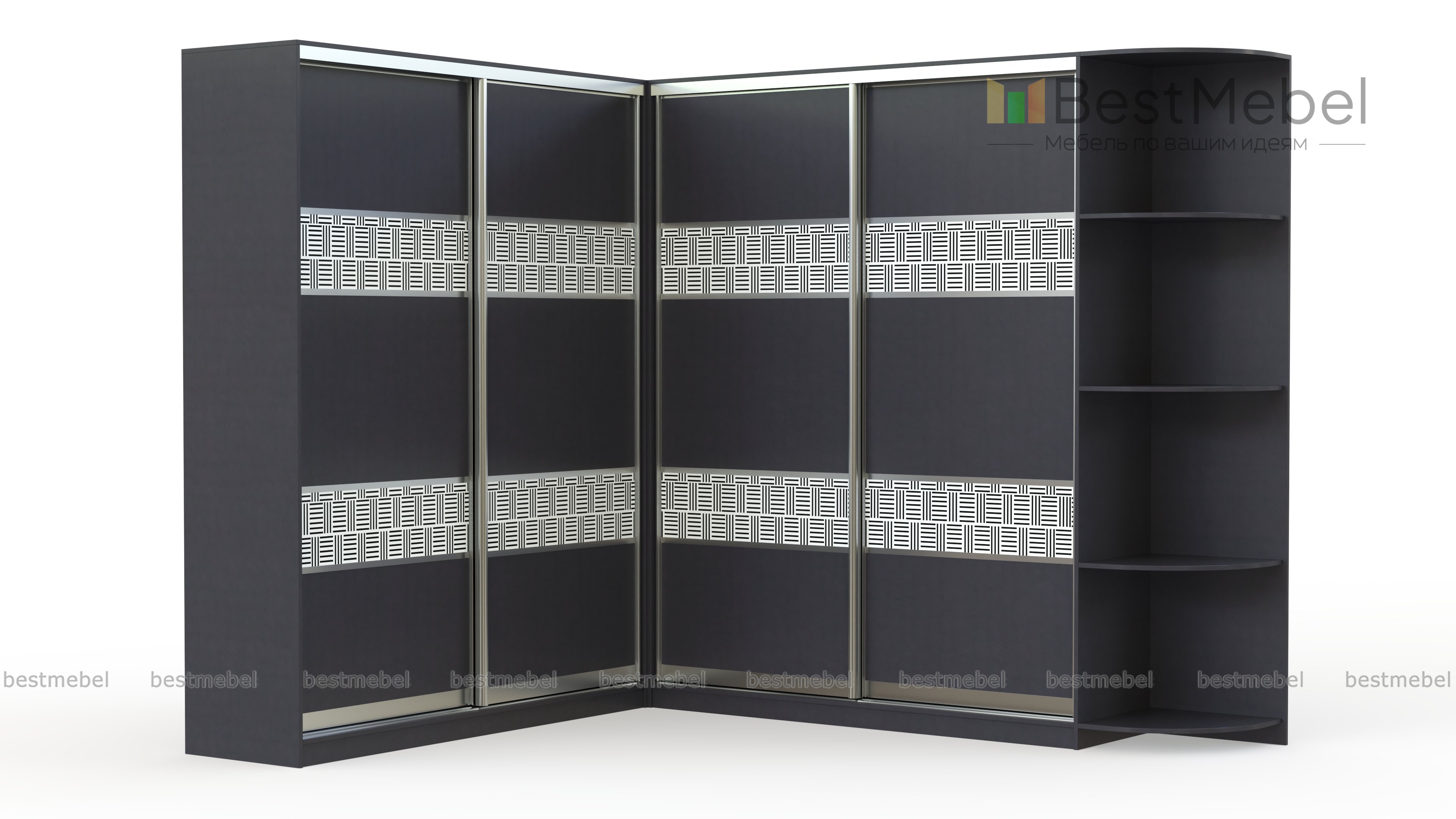 Шкаф-купе угловой Флэш BMS - строгий и стильный в темной палитре, дополнит пространство спальни или прихожей. Два расположенных под углом двухдверных отделения предназначены для хранения одежды и постельных принадлежностей, а для книг, важных мелочей и любимого декора предусмотрен торцевой радиусный стеллаж. Фасады раздвижных дверей украшают контрастные вставки с геометрическим рисунком-фотопечатью. Купить шкаф-купе угловой Флэш BMS вы сможете в нашем интернет-магазине, подобрав цвета и размеры.