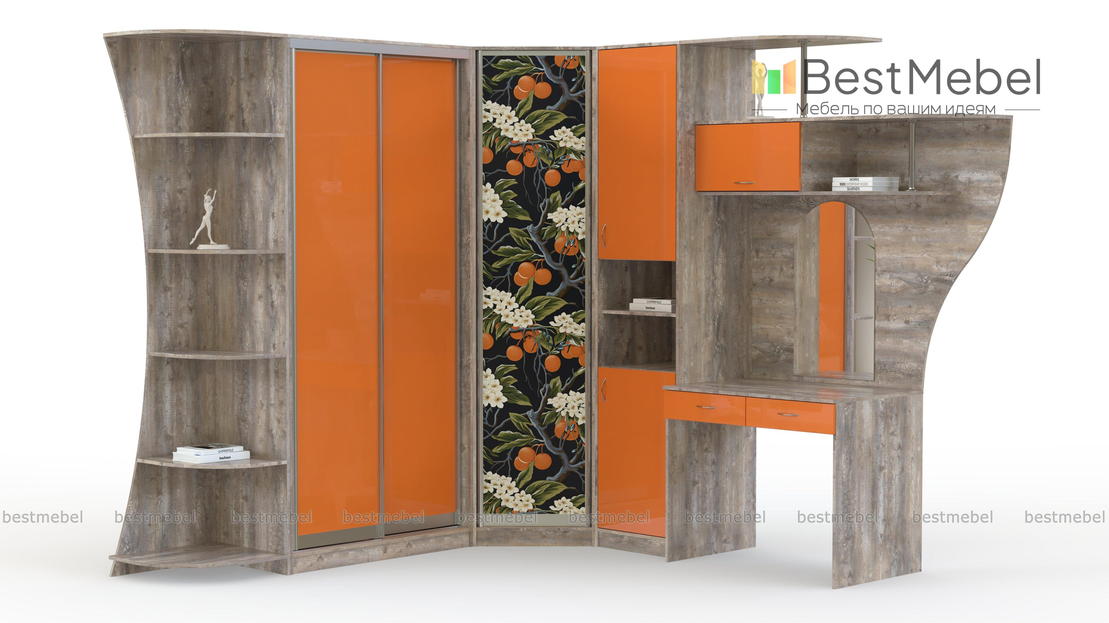Угловой шкаф-купе Лайм BMS объединил все необходимое для комфортного ухода за собой, хранения гардероба, всевозможных аксессуаров, материалов для работы и хобби. Композиция включает в себя угловой распашной шкаф, двухдверный шкаф-купе, комбинированный с полками пенал, туалетный столик с надстройкой и эффектно вырезанный стеллаж. Для оформления фасадов использованы цветной глянец и контрастная сочная фотопечать. Купить угловой шкаф-купе Лайм BMS вы сможете в нашем интернет-магазине, подобрав цвета и размеры.