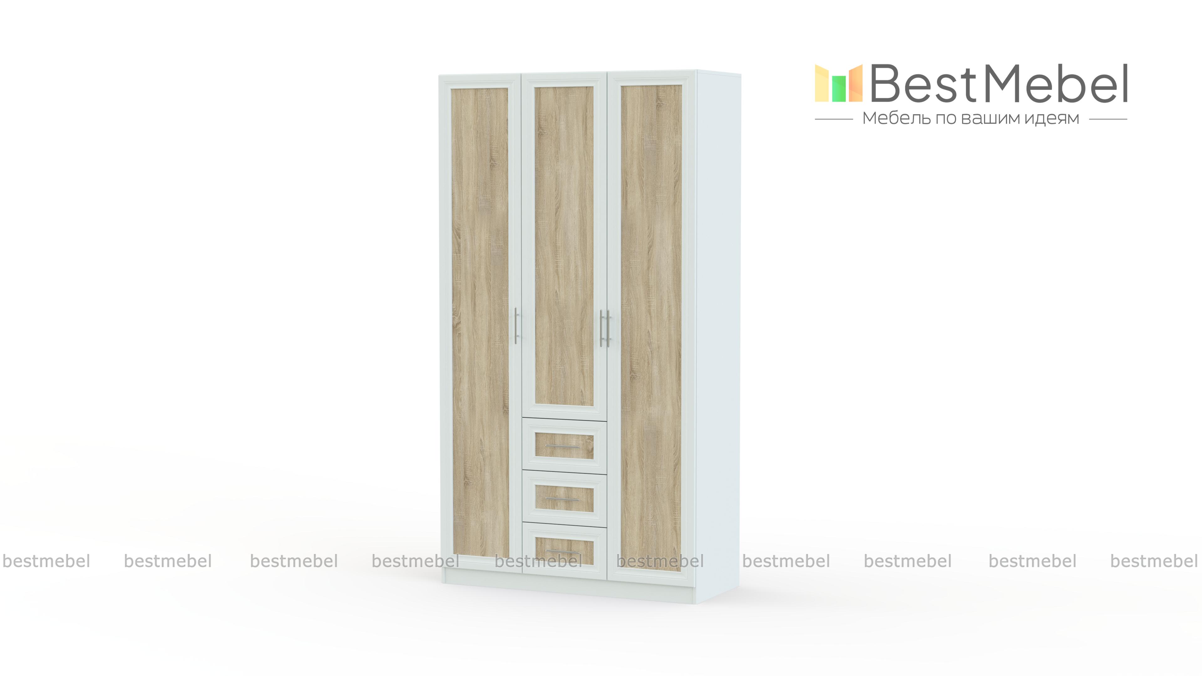 Распашной шкаф Крона 15 BMS отличается характерными для всей серии надежностью, вместительностью и элегантным дизайном. Модель выполнена в контрастных тонах светлой гаммы и органично впишется в интерьер спальни или прихожей. За тремя распашными дверцами с рамочными фасадами – два платяных отделения и центральная секция с полками и выдвижными ящиками для мелочей. Купить распашной шкаф Крона 15 BMS и оборудовать эффектную и функциональную комнату вам поможет наш интернет-магазин.