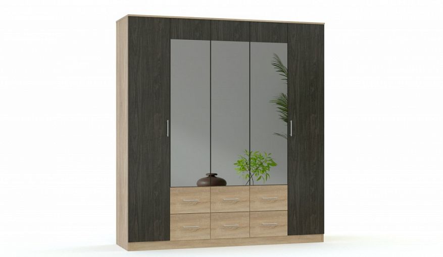 Распашной шкаф Модерн 14 BMS привлекает стильной геометрией линий, подчеркнутой сочетанием светлых и темных древесных тонов. Пятидверная модель, дополненная шестью выдвижными ящиками, поможет вам бережно разместить гардероб и постельные принадлежности. Зеркальные центральные створки позволят сэкономить на отдельном аксессуаре и придадут комнате дополнительную глубину и объем. Купить распашной шкаф Модерн 14 BMS вы сможете на сайте нашего интернет-магазина.