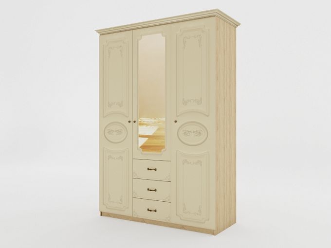 Шкаф 3-х дверный Ивушка BMS выполнен из экологичных материалов в классических древесных тонах. Декоративное оформление фасадов с карнизом, фрезерованным рисунком, изящно вырезанным зеркалом и ручками под бронзу придется по душе поклонникам традиционных интерьеров. Вместительная модель оборудована штангой для вешалок с одеждой, бельевой секцией и тремя выдвижными ящиками для мелких вещей. Купить шкаф 3-х дверный Ивушка BMS, подобрав оптимальное цветовое решение, вы сможете по лучшей цене в нашем интернет-магазине.