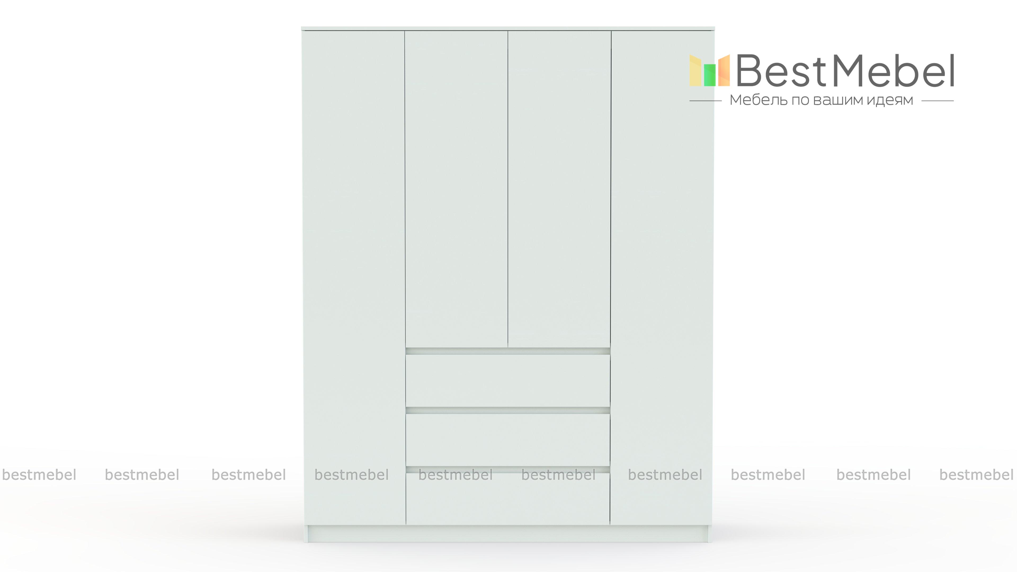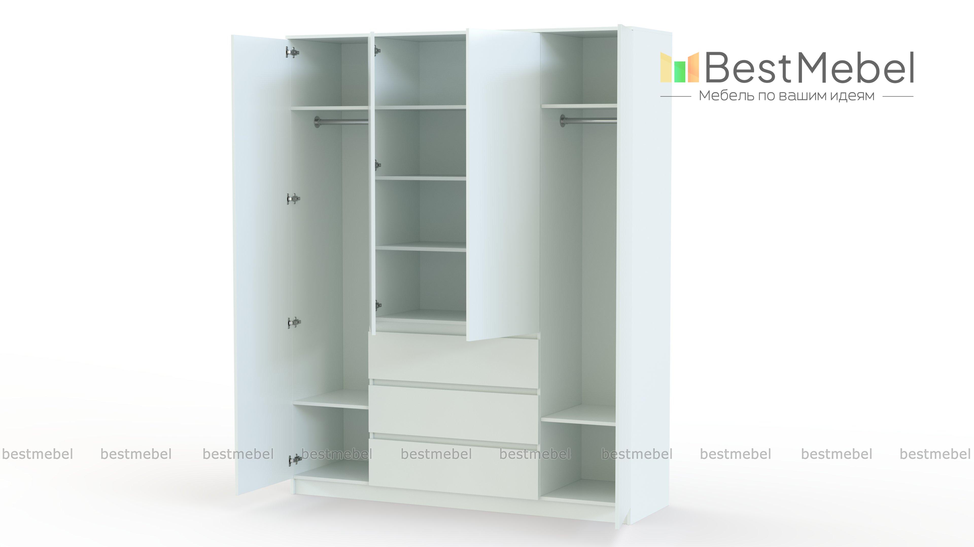 Шкаф распашной Мальм Malm 4 - это стильная простота и геометричные формы. За четырьмя распашными дверцами без лицевой фурнитуры скрыты платяные отделения и бельевые полки, а в центре располагаются три широких выдвижных ящика. Базовый цвет и отсутствие лишних деталей позволяют легко комбинировать шкаф с другой современной мебелью и практически любым декором. Купить шкаф распашной Мальм Malm 4 вы сможете в нашем интернет-магазине с выбором цвета и размеров. Выбирайте мебель в стиле IKEA (ИКЕА) от производителя BestMebelShop!